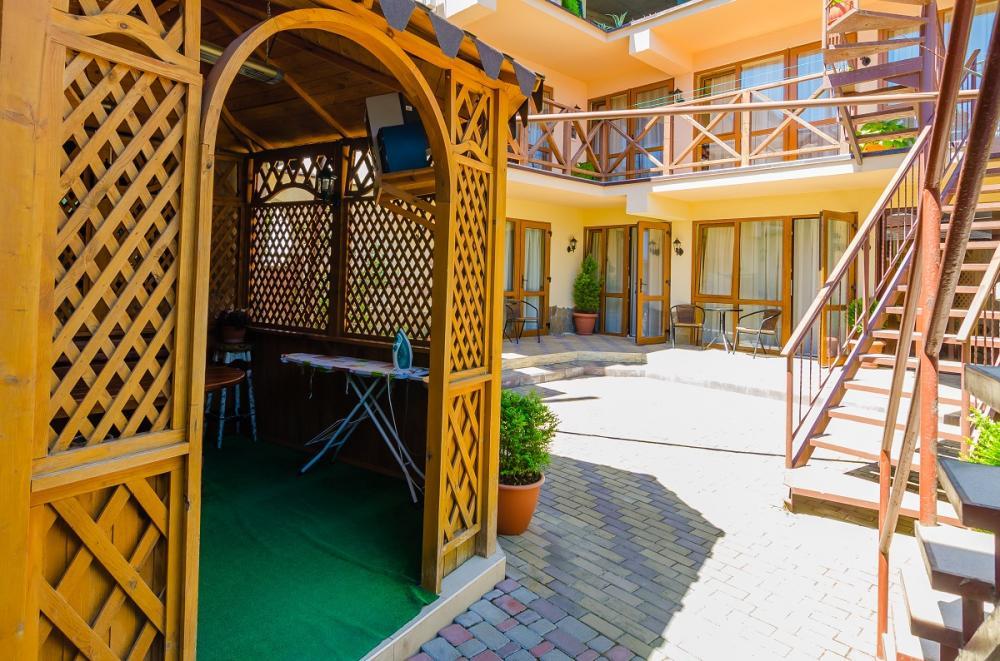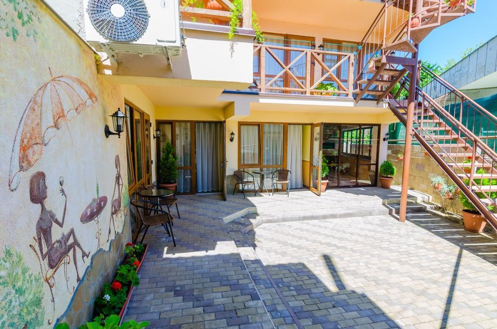 В частном доме «Уютный дворик» сдается 11 уютных 2-х местных комнат (доп мест нет). В каждой комнате: большая двуспальная кровать, шкаф, журнальный столик, зеркало, телевизор, интернет, кондиционер, холодильник, бокалы, санузел/душ, банные полотенца, горячая и холодная вода круглосуточно. Какой именно номер и на каком этаже заранее сказать невозможно. С детьми старше 10 лет. С животными не принимаем. На территории дома имеется кухонная зона, которая оборудована микроволновой печью, чайником и необходимой посудой. Плиты и мангала нет. Курение строго в определенном месте. Стирка белья за дополнительную плату. Гладильная доска, утюг, фен в зоне общего пользования. Парковка общественная, бесплатная возле дома (при наличии мест). Недалеко от дома есть платная. До моря и Центральной набережной 500 метров по прямой дороге. В шаговой доступности находится магазин первой необходимости, супермаркет пуд, ресторан Старый город, дельфинарий, троллейбусное кольцо, автовокзал.