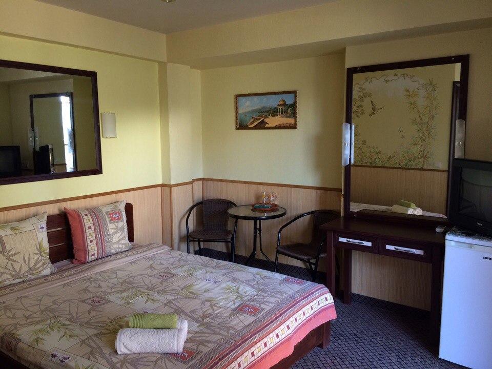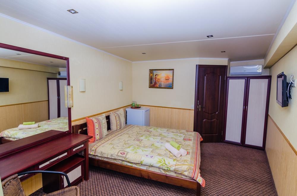 | Большая двуспальная кровать, шкаф, журнальный столик, зеркало, телевизор, интернет, кондиционер, холодильник, бокалы, санузел/душ, банное полотенце, горячая и холодная вода круглосуточно. С детьми старше 10 лет. |