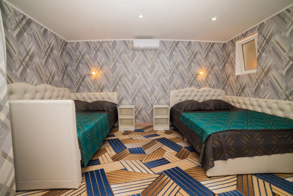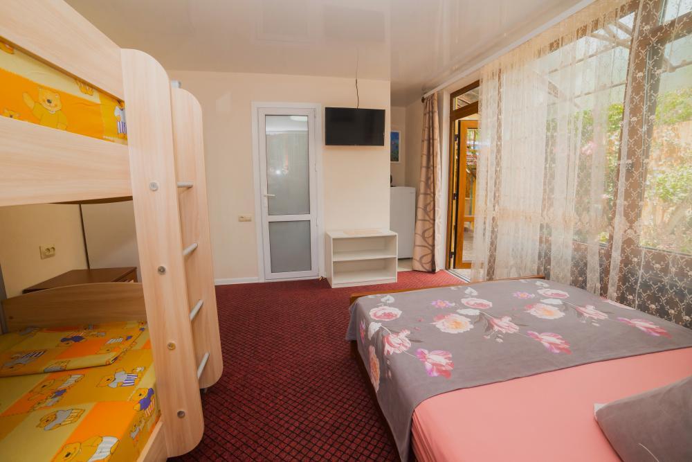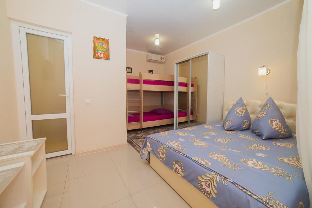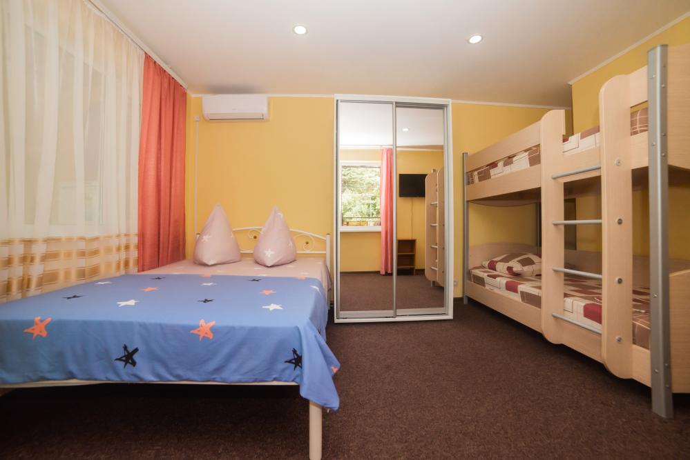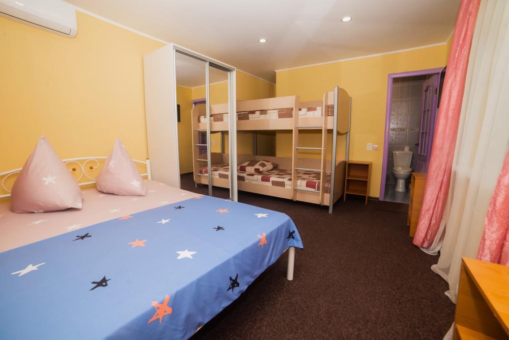 | Двуспальная и двухъярусная кровати, шкаф, прикроватные тумбочки. Индивидуальное место для отдыха перед номером. Вмещает от 2-х до 4-х человек |