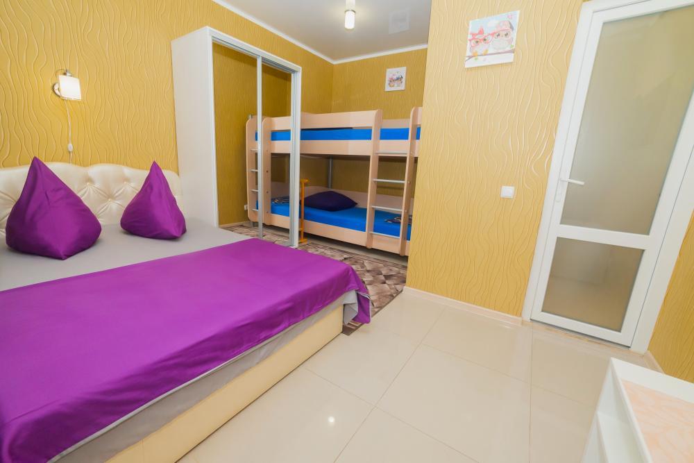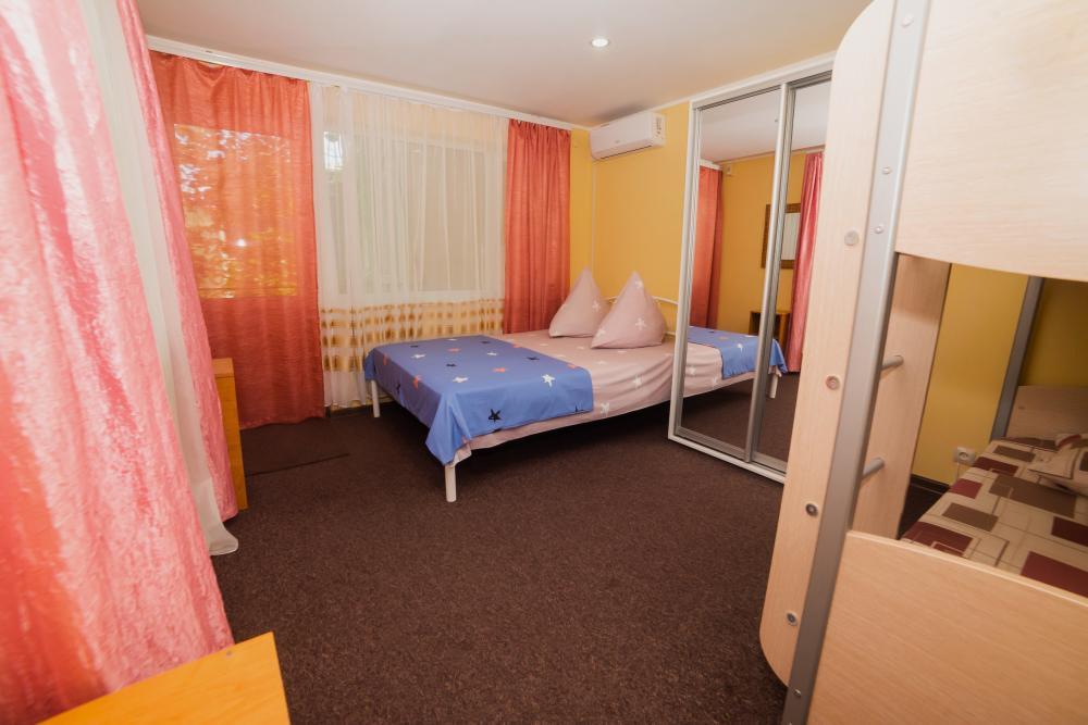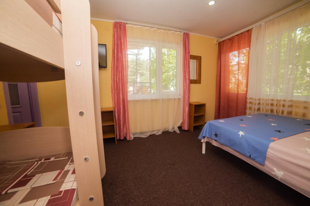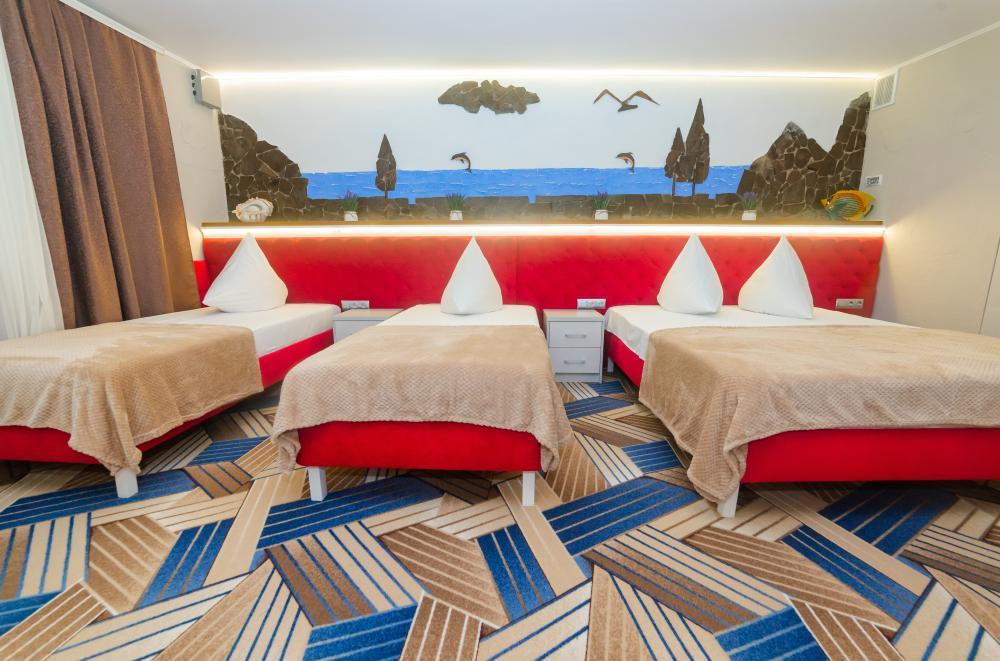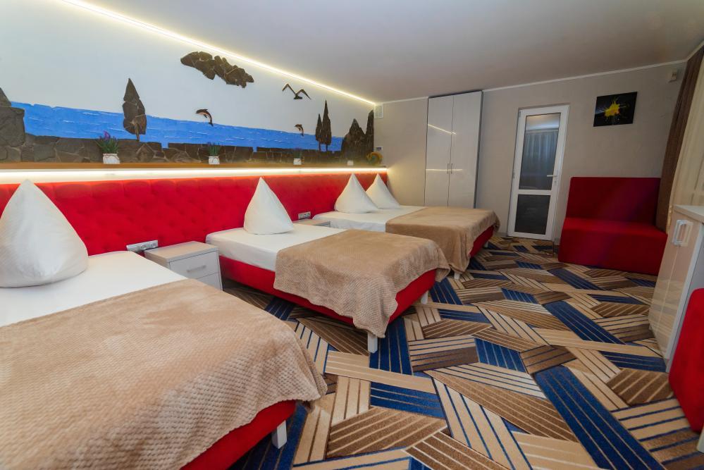 | Двуспальная и двухъярусная кровати, шкаф, прикроватные тумбочки. Индивидуальное место для отдыха перед номером. Вмещает от 2-х до 4-х человек |