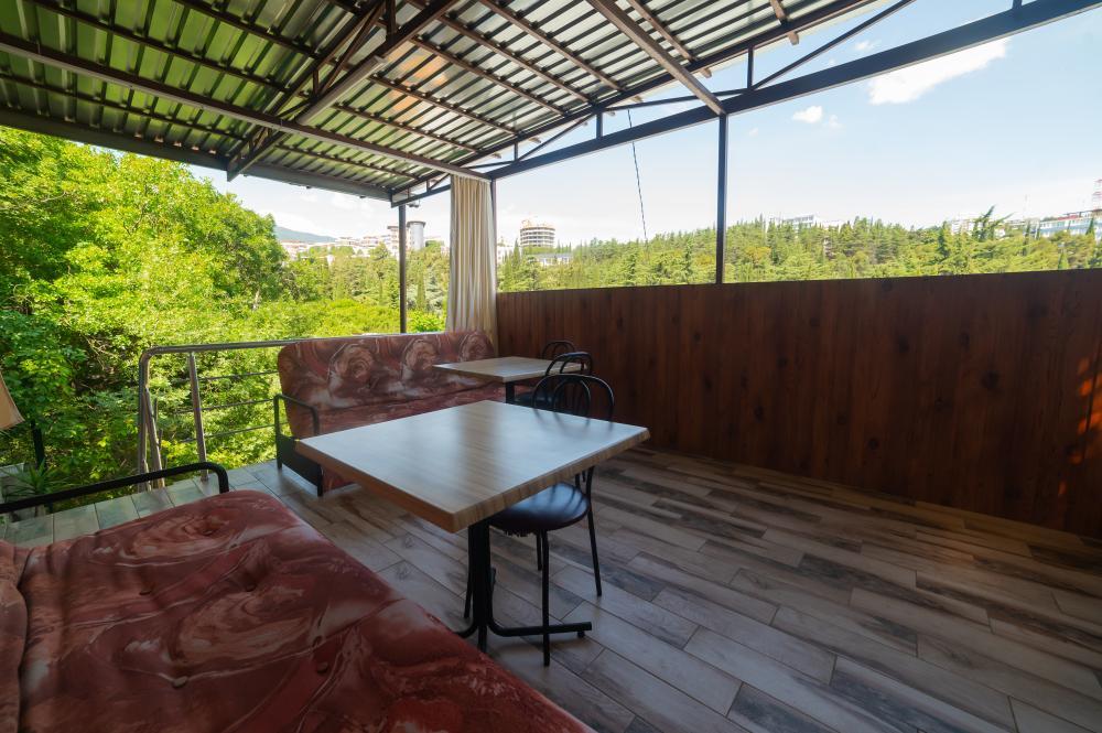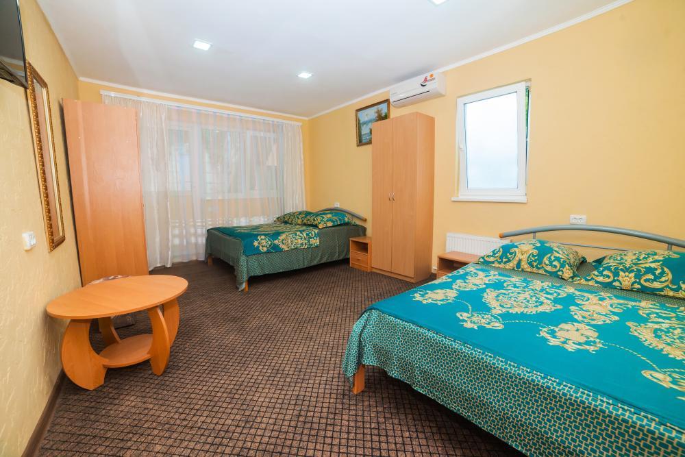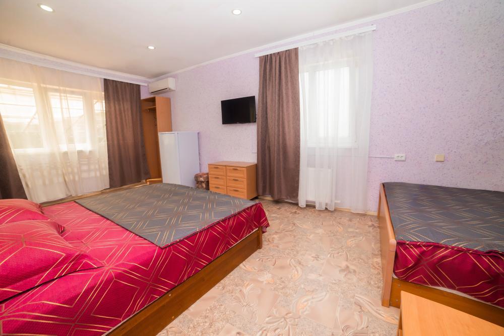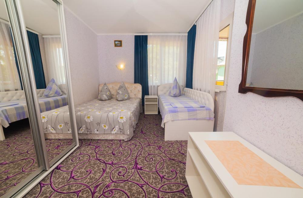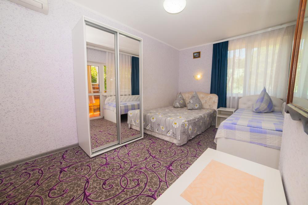 | Двуспальная и односпальная кровати, шкаф, прикроватные тумбочки. Индивидуальное место для отдыха на балконе. Вмещает от 2-х до 3-х человек |