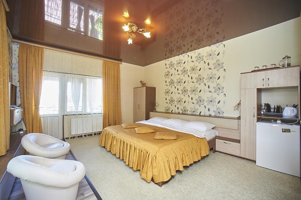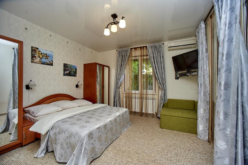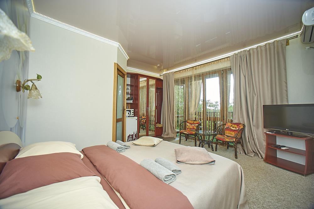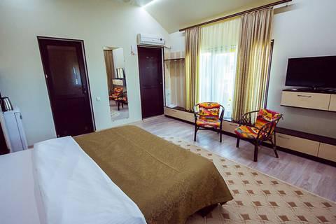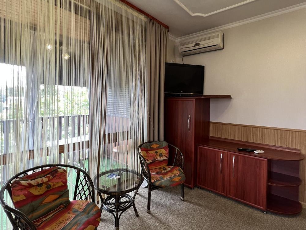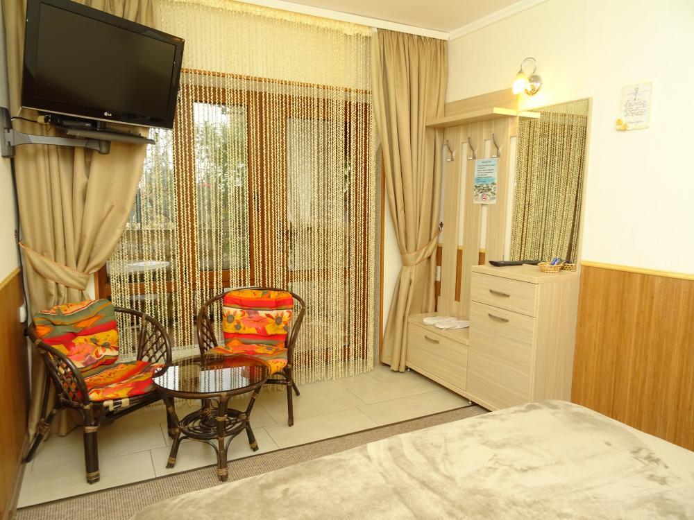 | Двухместный «Стандарт» рассчитан на проживание двух человек с возможностью дополнительного места. Комната оборудована всем самым необходимым: телевизор (спутниковое телевидение), кондиционер, холодильник, электрочайник, набор посуды, душ (холодная/горячая вода круглосуточно), туалет, фен, WI-FI интернет. На уютном балконе с видом на сад есть стол со стульями. Уборка номеров производится 3 раза в неделю. Замена постельного белья – через 5 дней. |