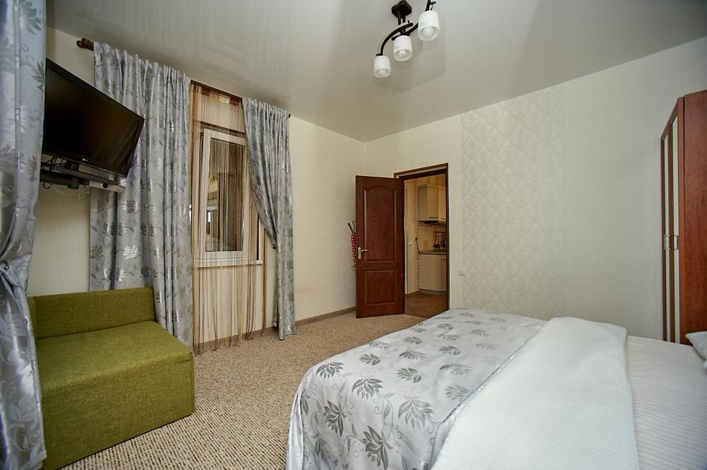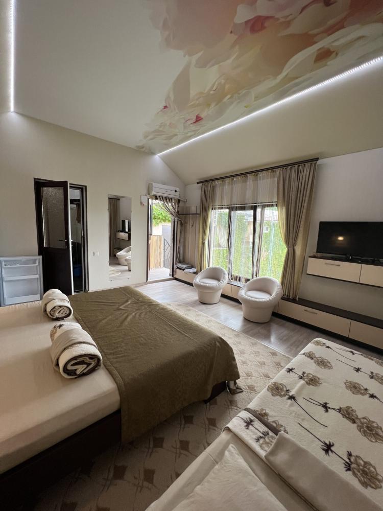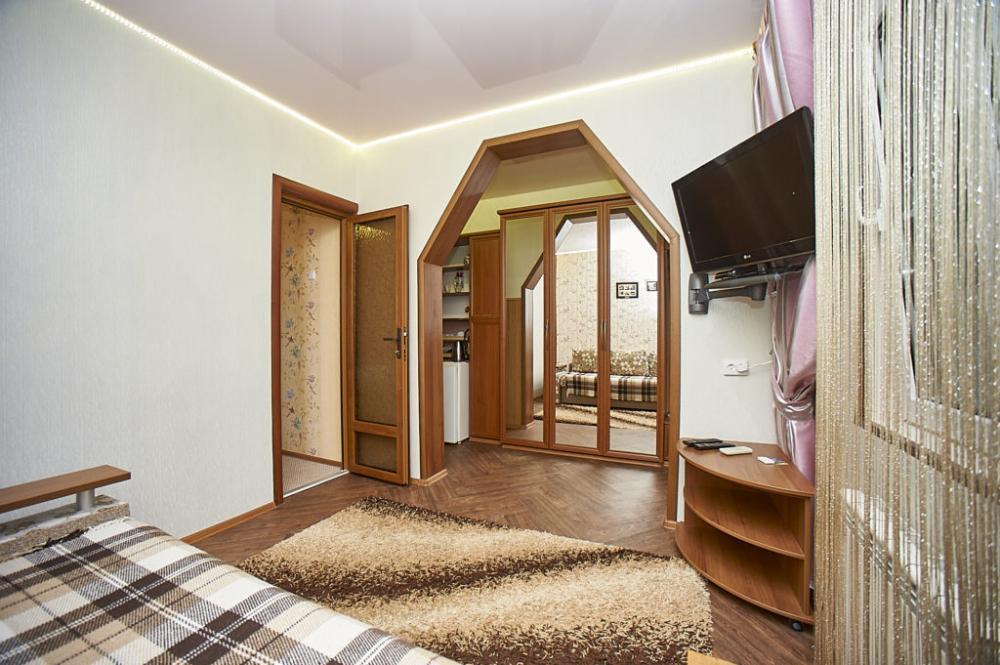 | Номер со смежными комнатами рассчитан на проживание трех-четырех человек. Комнаты оборудованы всем самым необходимым: LCD-телевизор (спутниковое телевидение), кондиционер, холодильник, электрочайник, набор посуды, душ (холодная/горячая вода круглосуточно), туалет, фен, WI-FI интернет, тапочки. На уютном балконе стол со стульями. Уборка комнат производится 3 раза в неделю. Замена постельного белья – через 5 дней. |