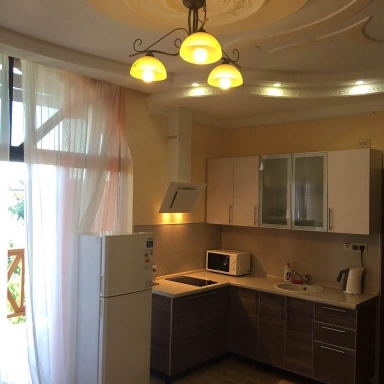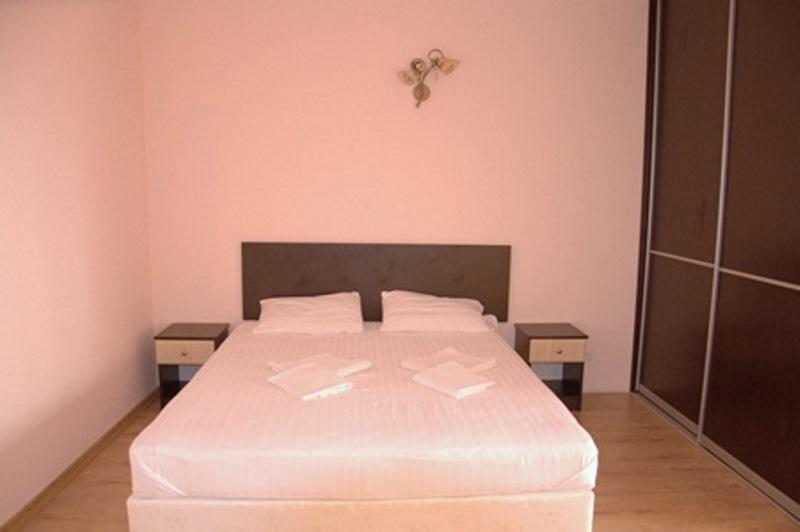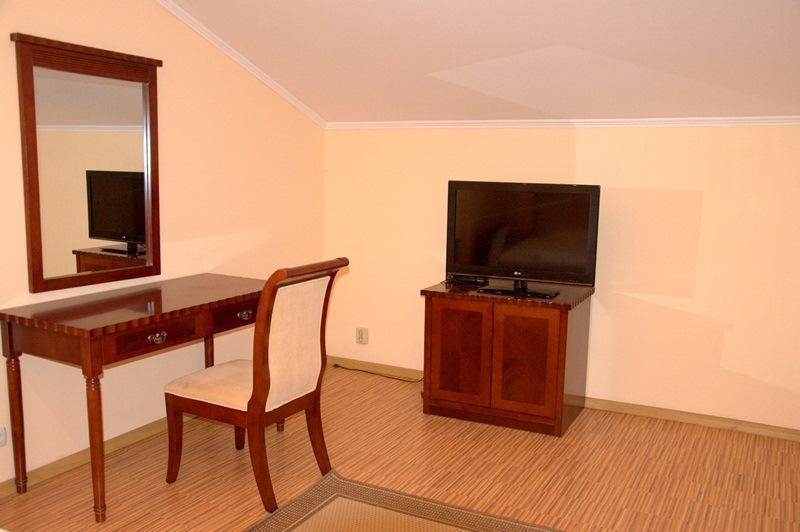 | Шкаф-купе, большая двуспальная кровать с ортопедическим матрацем (итальянская мебель), раскладывающийся угловой диван, кофейный столик, туалетный стол с большим зеркалом, два больших LCD-телевизора с лучшими каналами кабельного телевидения. Студия кухня с полным набором посуды и всего необходимого, обеденный стол, стулья, двухкамерный холодильник. Уборка в номере по требованию, смена постельного белья 1 раз в 5 суток |