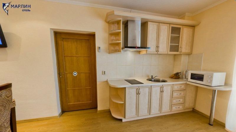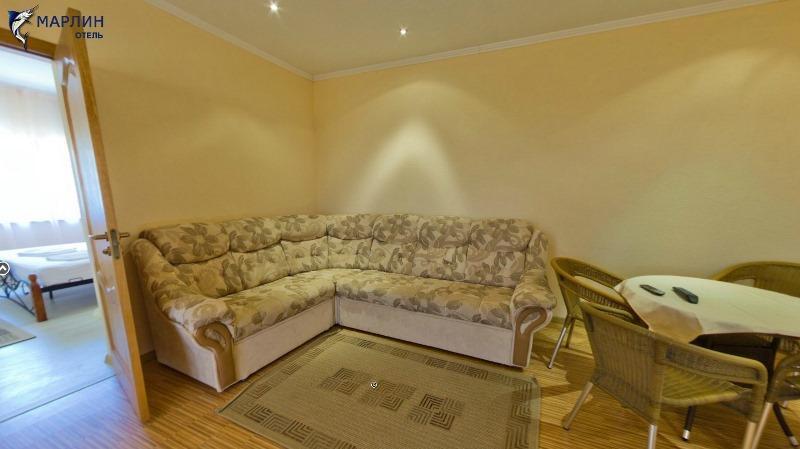 | Двухкомнатный номер с индивидуальной кухней, рассчитан на 4х местное проживание. Площадь номера 60 м2, находится на 2 этаже с балконом и видом на море. В номере есть зеркальный шкаф-купе, большая двуспальная кровать с ортопедическим матрацем (итальянская мебель), раскладывающийся угловой диван, кофейный столик, туалетный стол с большим зеркалом, два больших LCD-телевизора с лучшими каналами кабельного телевидения, бесплатный беспроводной интернет WI-FI, две прикроватные тумбочки, два современных кондиционера с очистителем воздуха, сейф, санузел (душ, туалет, умывальник, фен). Студия-кухня с полным набором посуды и всего необходимого, обеденный стол, стулья, двухкамерный холодильник. |