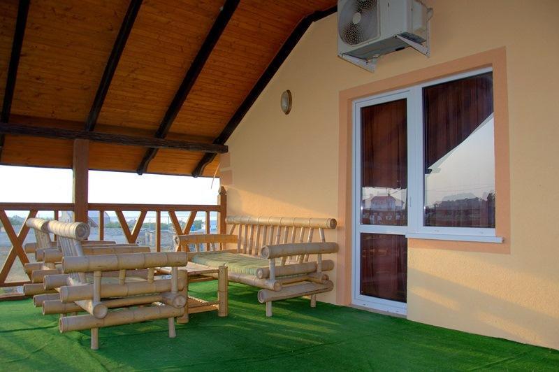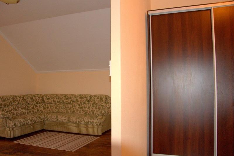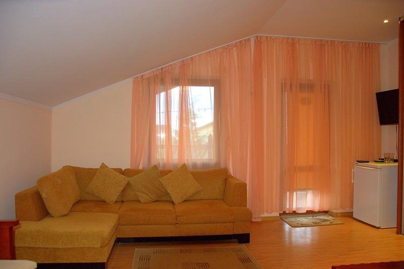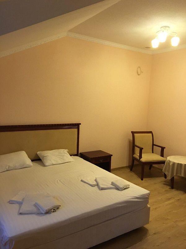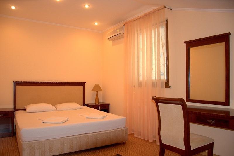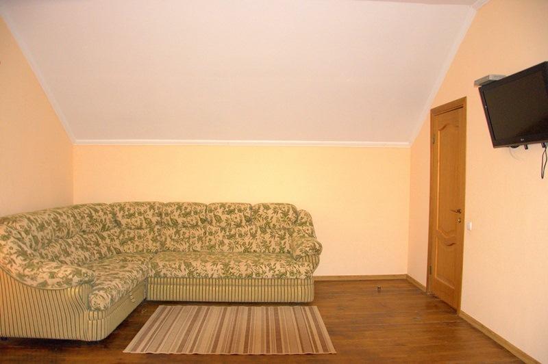 | Находится на 2-м этаже отдельно стоящего здания, с балконом, мебелью. В номерах: двуспальная кровать, две прикроватные тумбочки, туалетный столик с большим зеркалом, раскладывающийся угловой диван, 2 LCD TV спутниковыми каналами, сейф, холодильник, чайник, кондиционер, санузел (душ, туалет, умывальник). На балконе плетеная мебель. |
