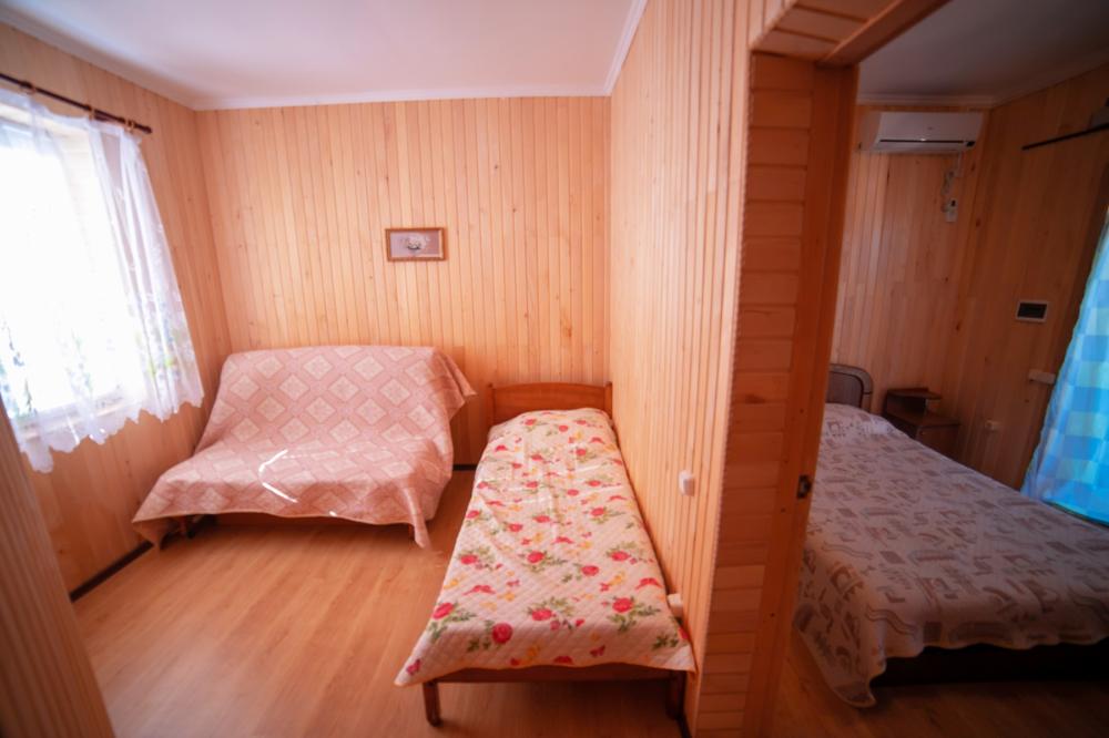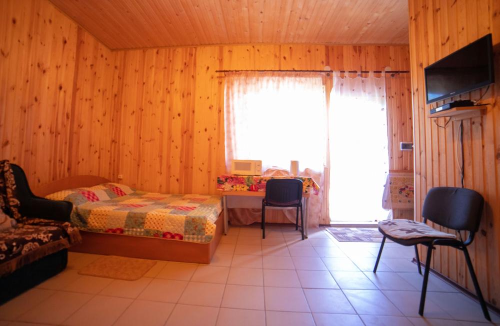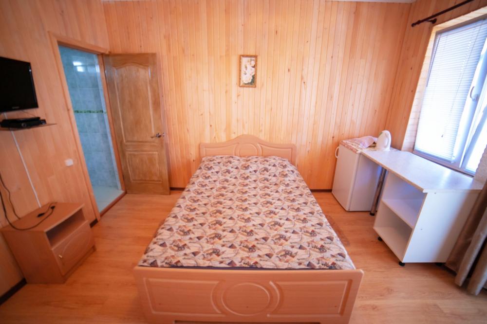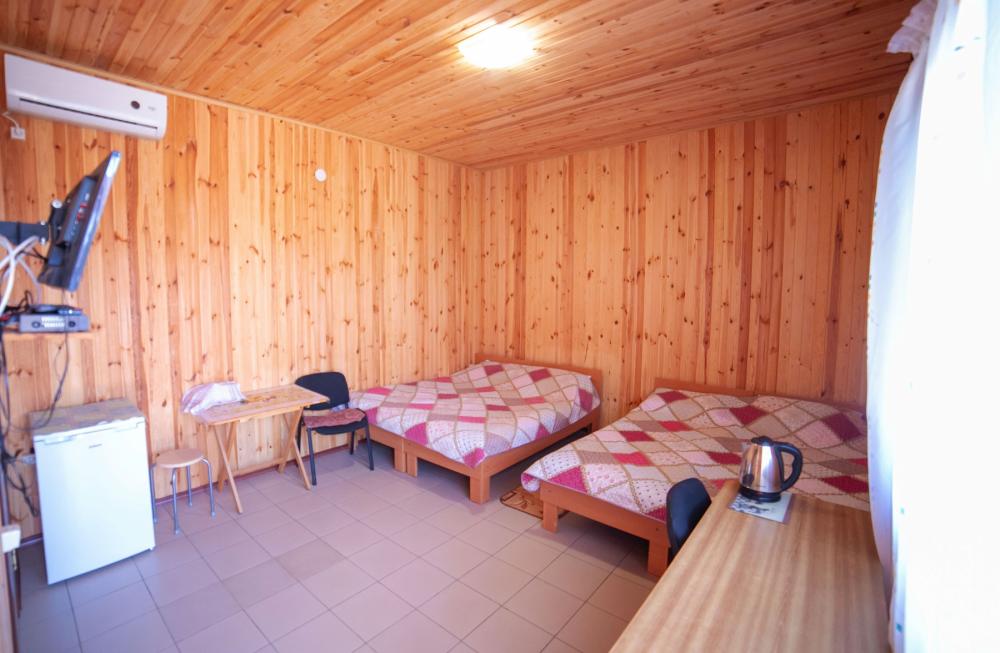 | Четырехместный номер находится на первом этаже, со всеми удобствами, с видом на виноградник. Возле номера терраса со столиком и стульями для отдыха. Номер отделан деревом. В номере круглосуточно холодная и горячая вода, кондиционер, холодильник, микроволновая печь, телевизор, эл чайник, посуда. Таких номеров два и отличаются они конфигурацией спальных мест. Стоимость доп места 700 рублей в сутки. |