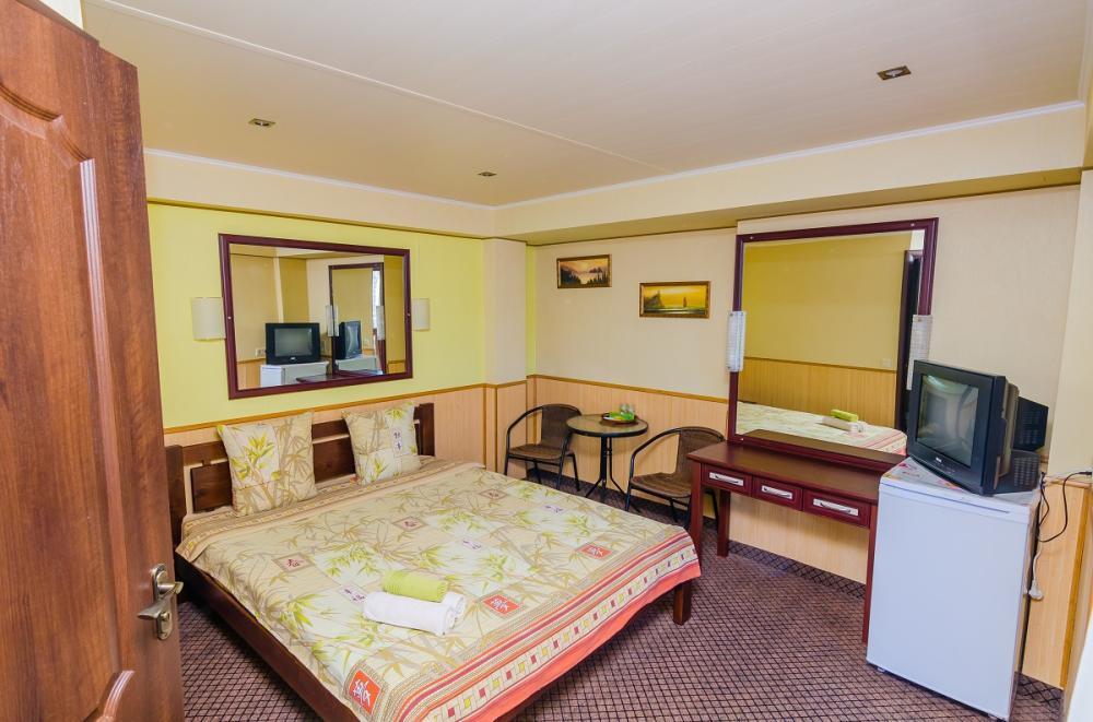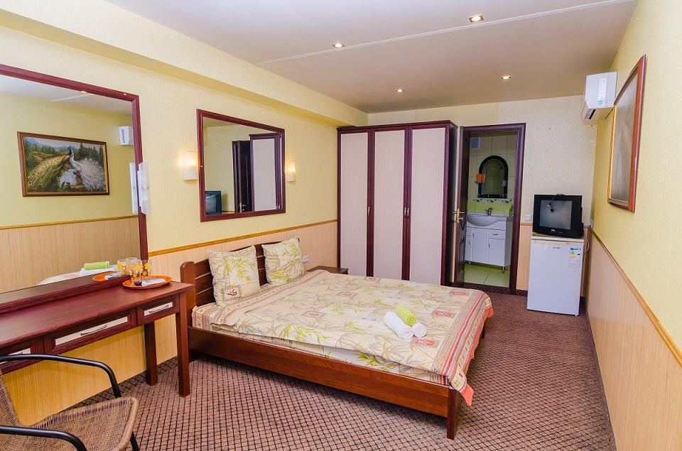 | Большая двуспальная кровать, шкаф, журнальный столик, зеркало, телевизор, интернет, кондиционер, холодильник, бокалы, санузел/душ, банное полотенце, горячая и холодная вода круглосуточно. С детьми старше 10 лет. |