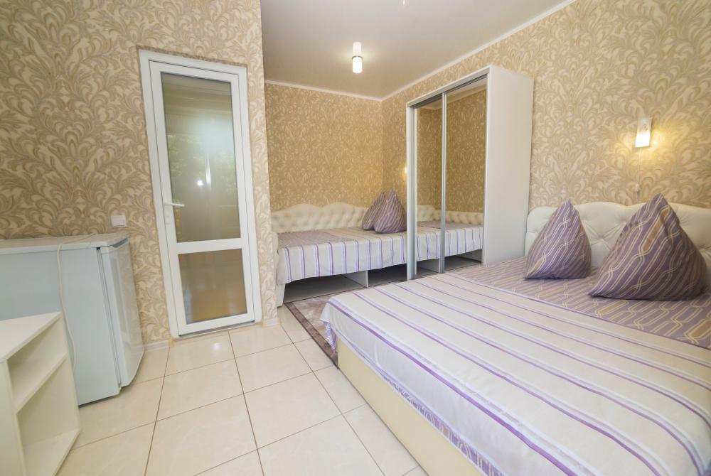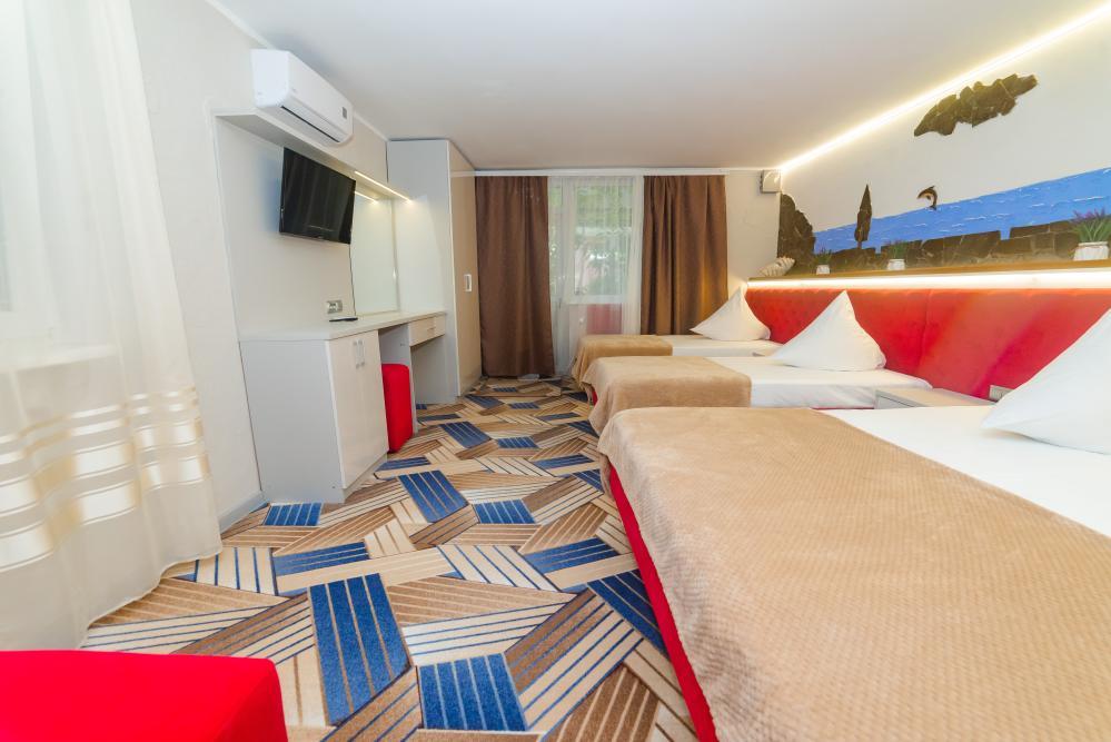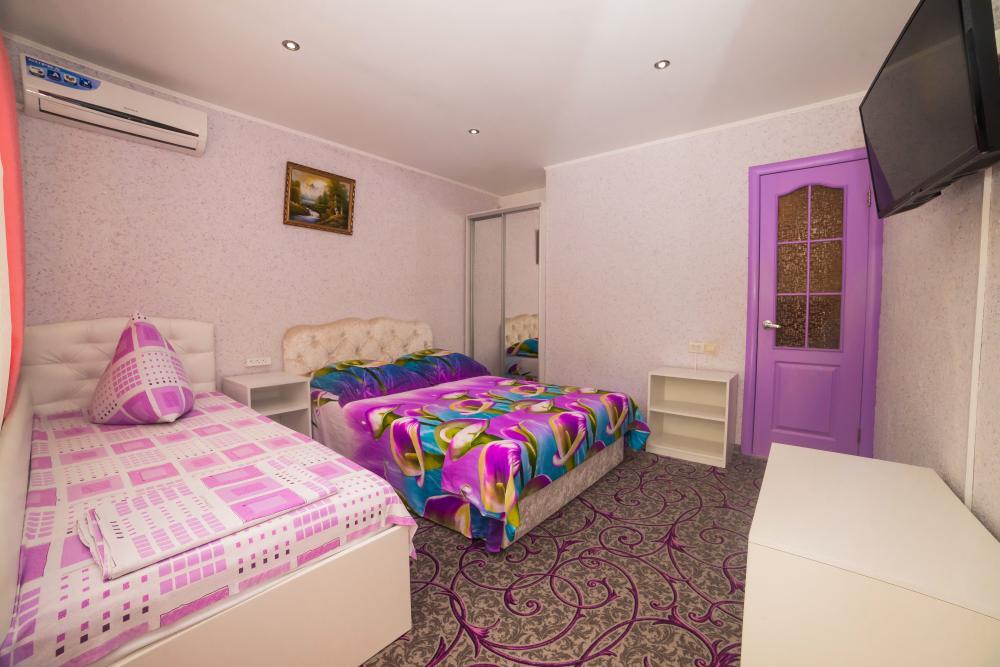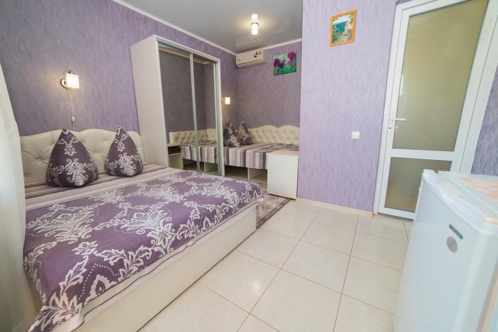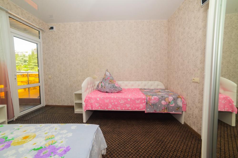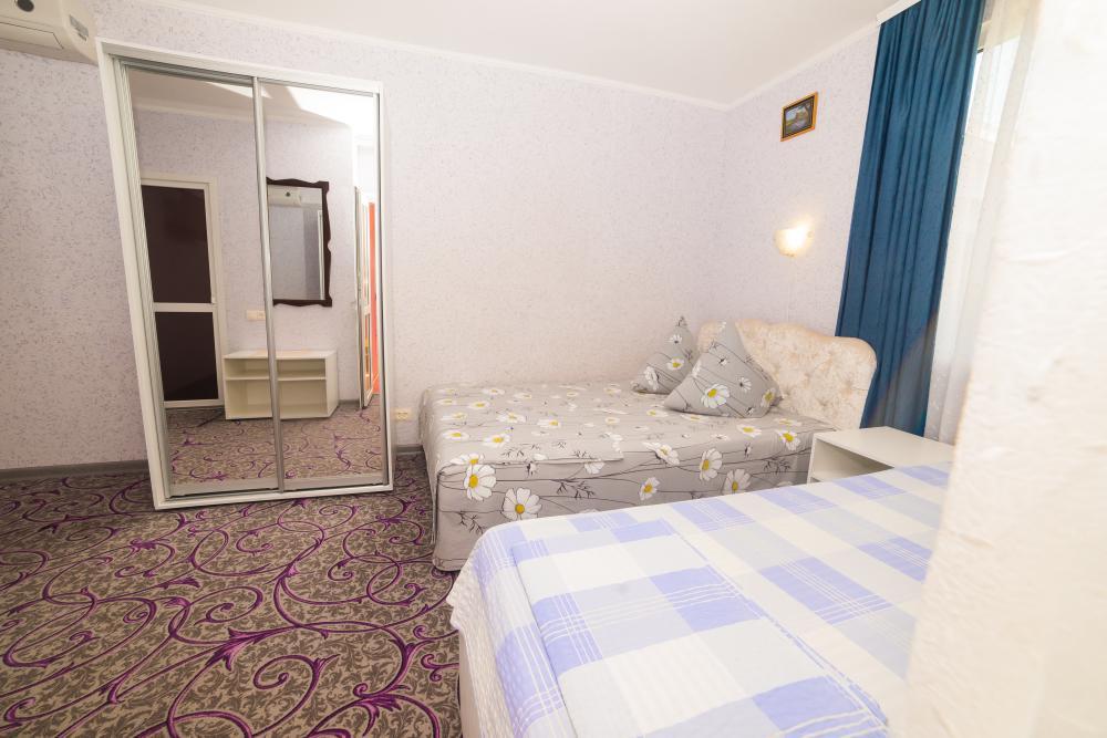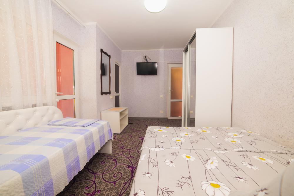 | Двуспальная и односпальная кровати, шкаф, прикроватные тумбочки. Индивидуальное место для отдыха на балконе. Вмещает от 2-х до 3-х человек |