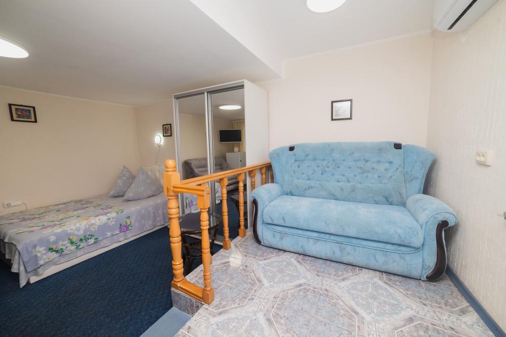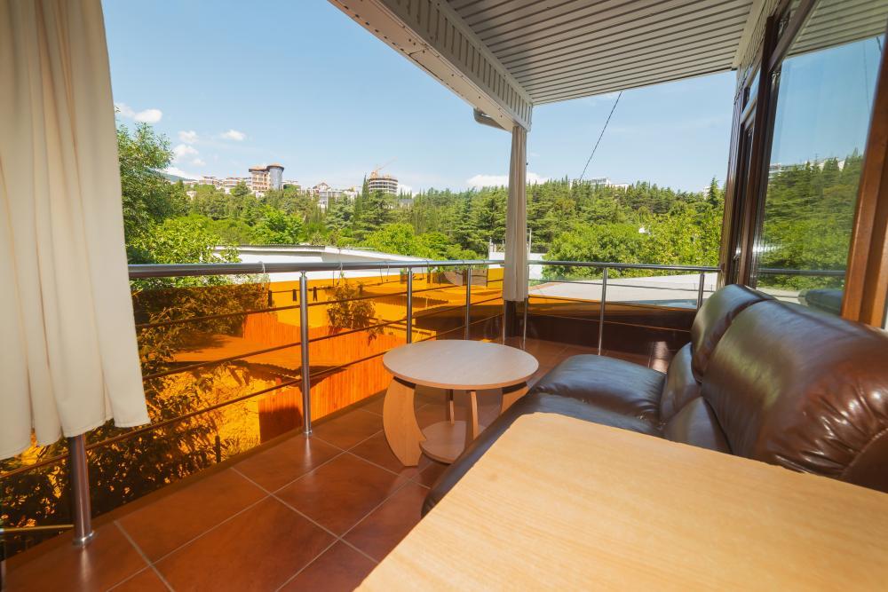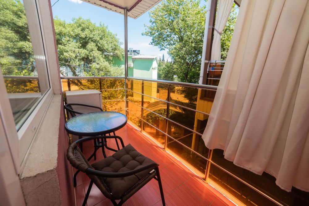 | Односпальная или двуспальная кровати, шкаф, стулья, прикроватные тумбочки, стол. Место для отдыха на балконе. Вмещает от 2-х до 3-х человек |