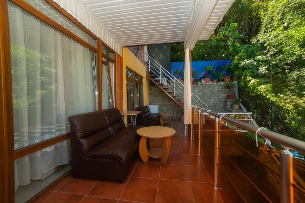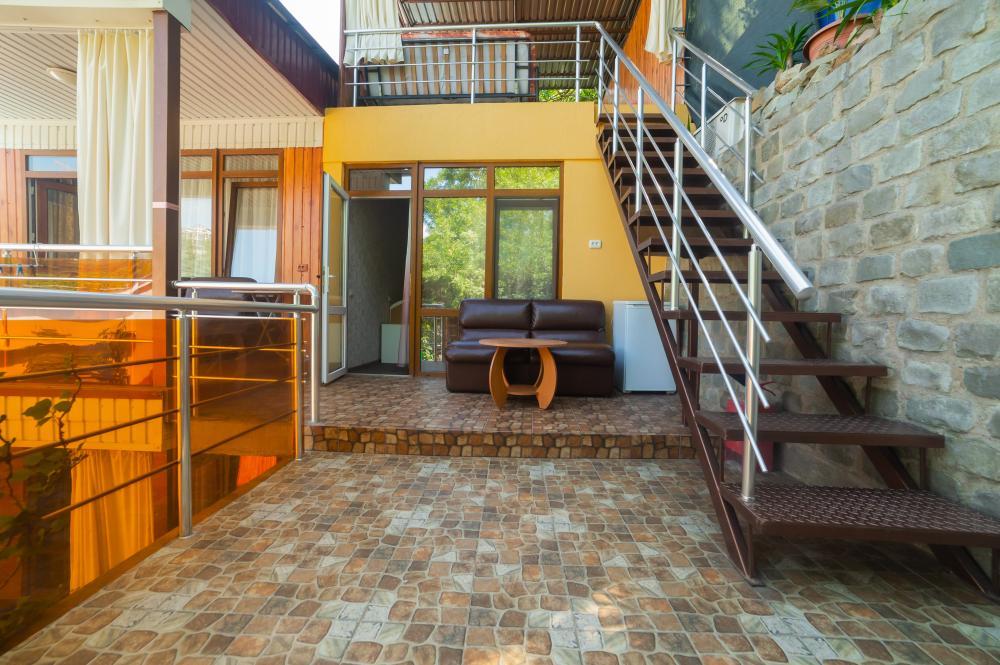 | Двуспальная кровать, диван-кровать, шкаф, стулья, прикроватные тумбочки, стол, журнальный столик. Индивидуальное место для отдыха перед номером. Вмещает от 2-х до 4-х человек |