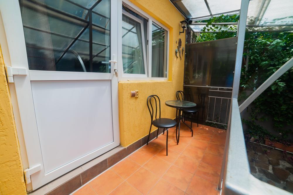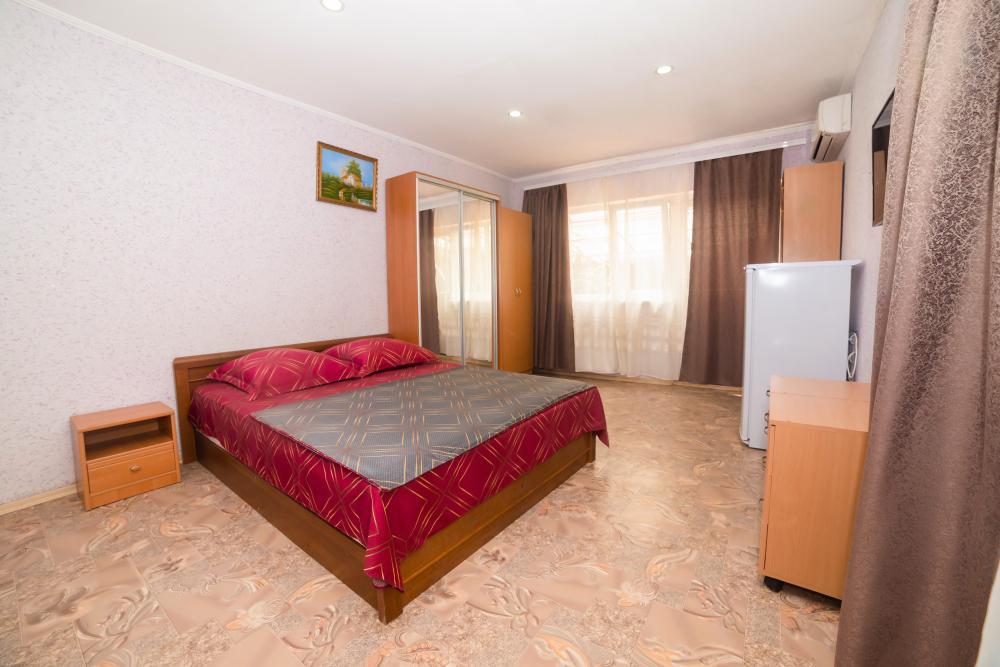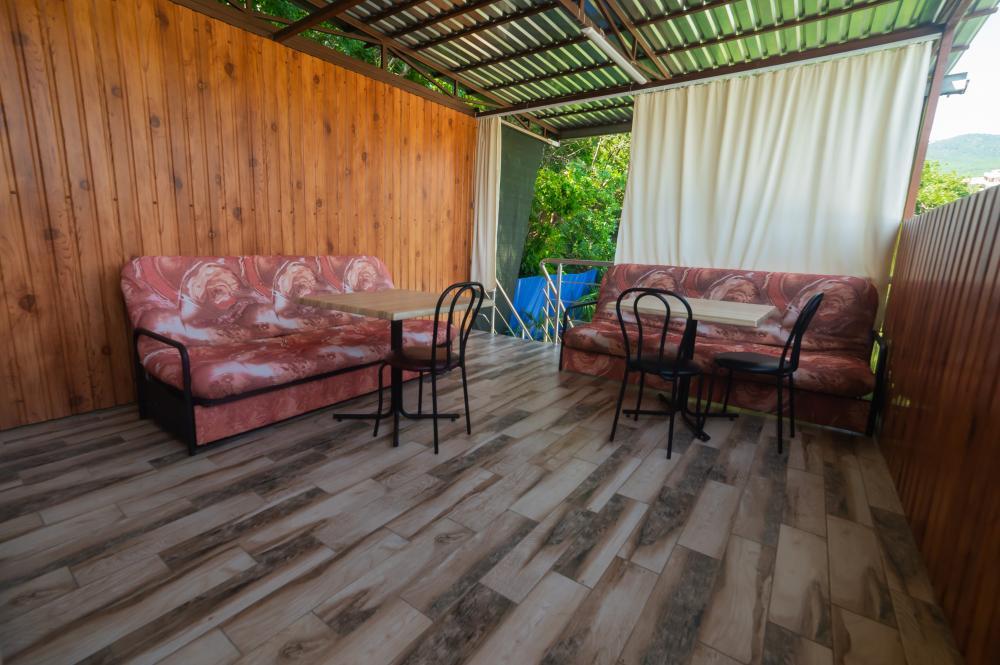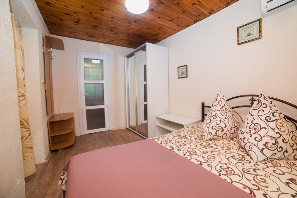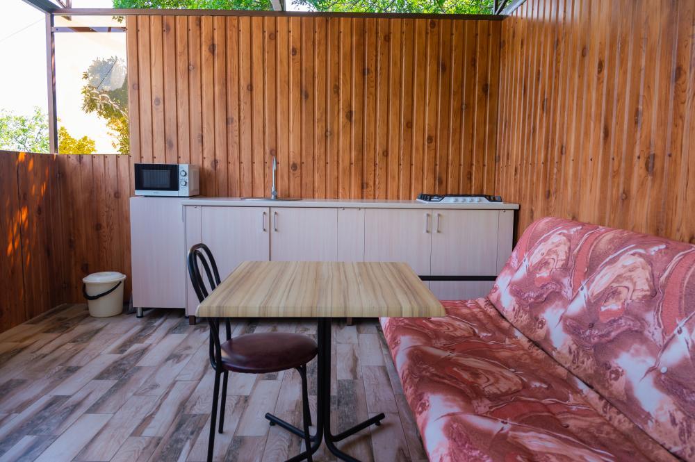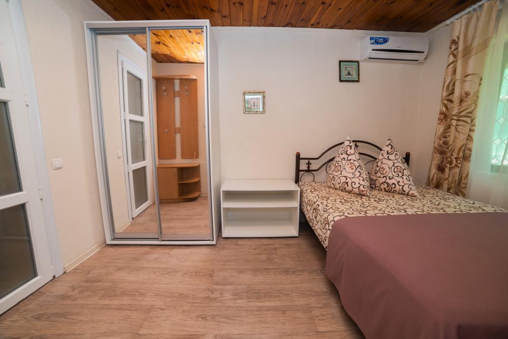 | Двуспальные кровати, шкаф, стулья, прикроватные тумбочки, стол, журнальный столик. Свой дворик с оборудованной кухней и отдельным входом. |