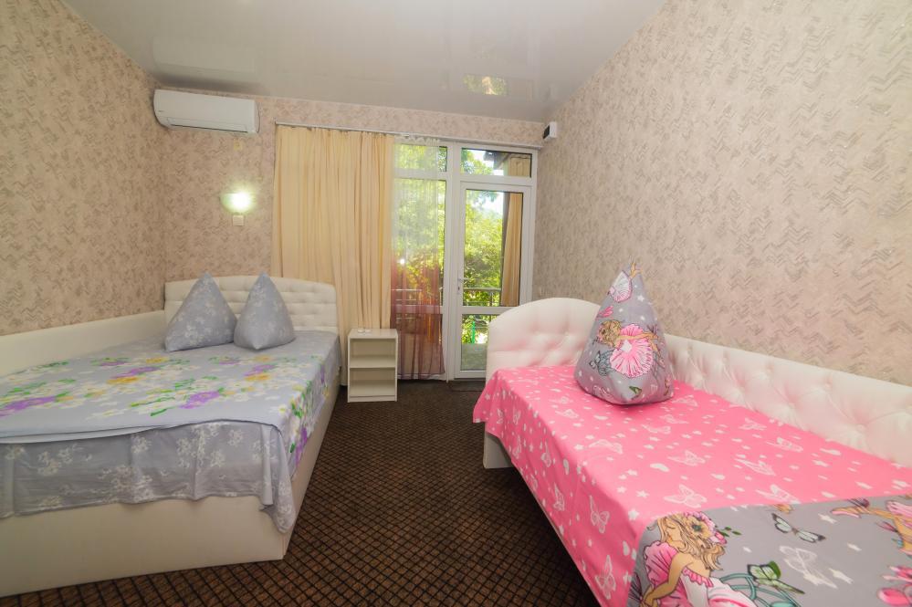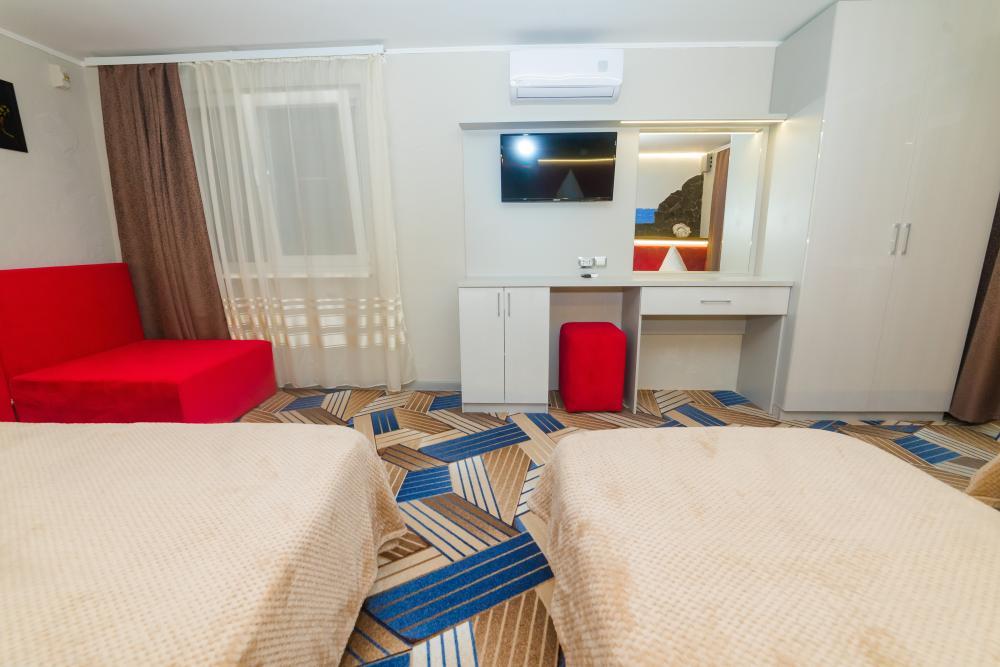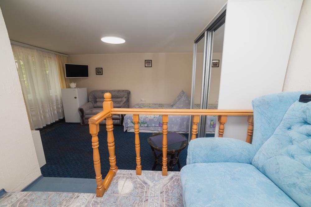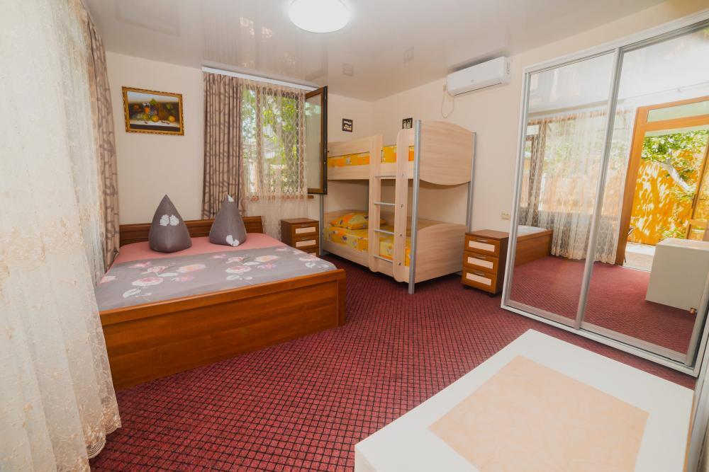 | Двуспальная и двухъярусная кровати, шкаф, прикроватные тумбочки. Индивидуальное место для отдыха перед номером. Вмещает от 2-х до 4-х человек |