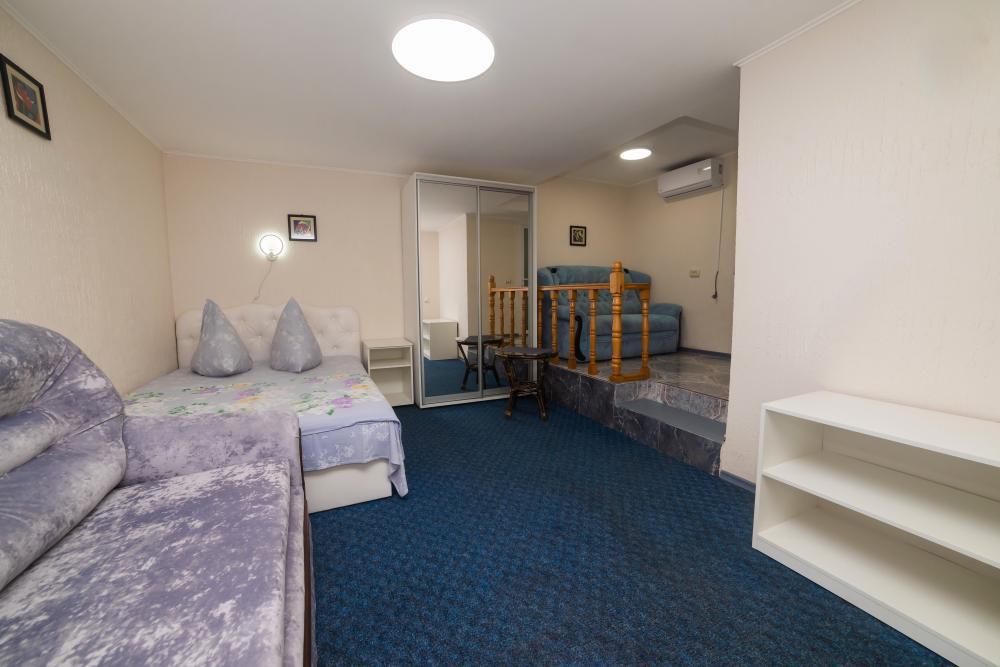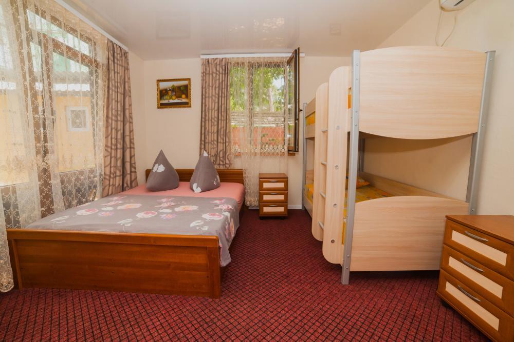 | Двуспальная и двухъярусная кровати, шкаф, прикроватные тумбочки. Индивидуальное место для отдыха на мансарде с кухней на два номера. Вмещает от 2-х до 4-х человек |