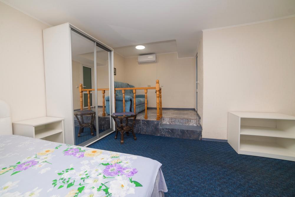 | Двуспальные кровати, шкаф, прикроватные тумбочки. Индивидуальное место для отдыха на мансарде с кухней на два номера. Вмещает от 2-х до 4-х человек |