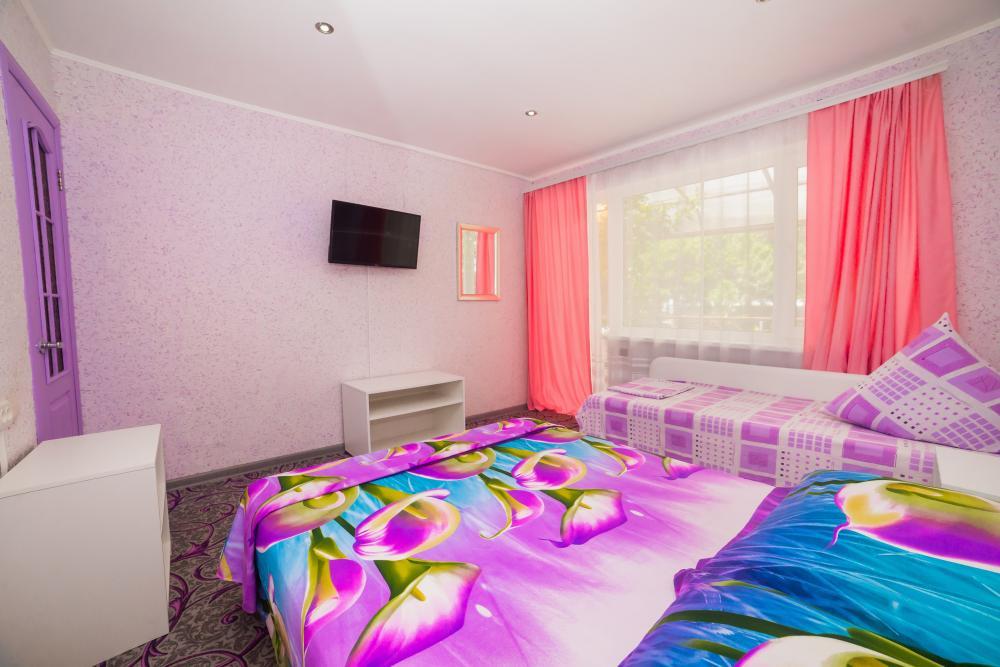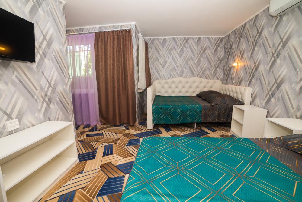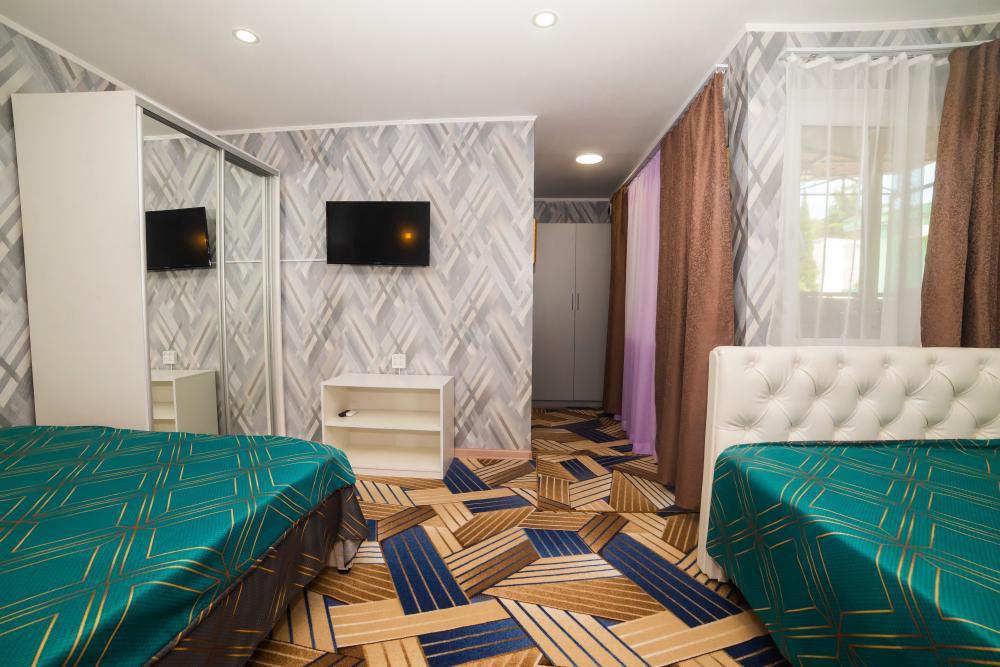 | Двуспальная и односпальная кровати, шкаф, прикроватные тумбочки. Индивидуальное место для отдыха перед номером. Вмещает от 2-х до 4-х человек |