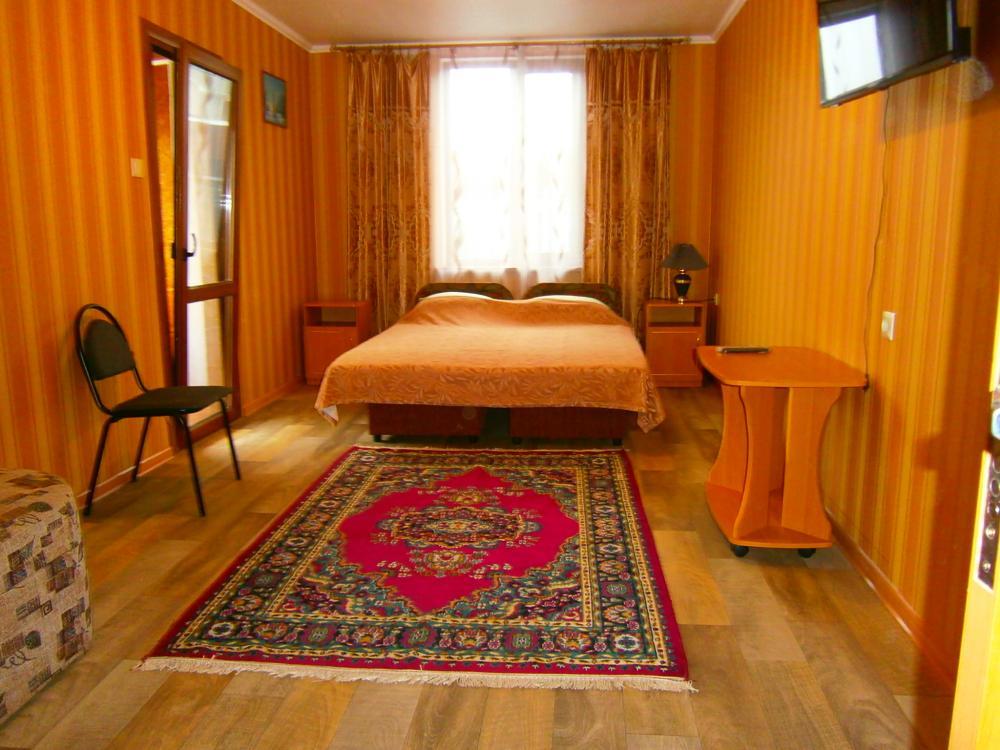 | Кухня и оборудование, посуда, горячая холодная вода постоянно. Спальные места: двуспальная кровать, диван кровать. В номере: телевизор, гладильная доска и утюг, шкаф, тумбочка, зеркало, стол журнальный, стулья, табурет и др. Вокруг номера зелень и свежесть. |