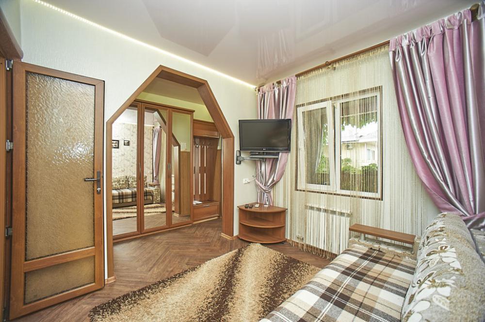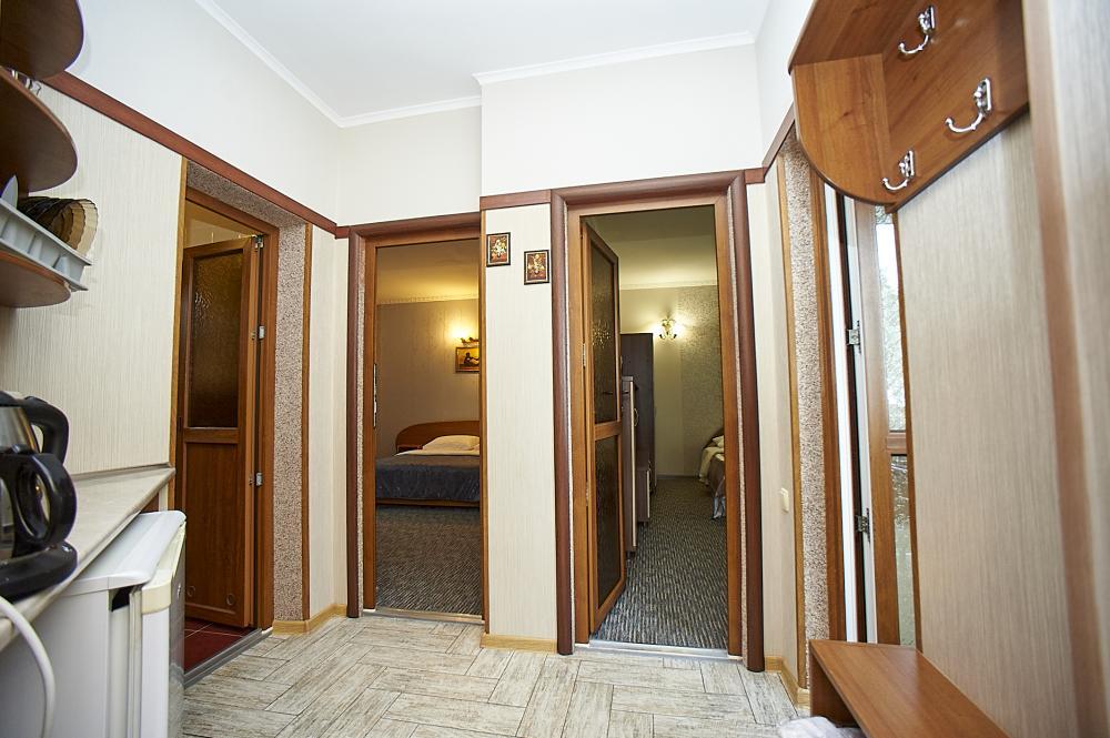 | Номер со смежными комнатами рассчитан на проживание трех-четырех человек. Комнаты оборудованы всем самым необходимым: LCD-телевизор (спутниковое телевидение), кондиционер, холодильник, электрочайник, набор посуды, душ (холодная/горячая вода круглосуточно), туалет, фен, WI-FI интернет, тапочки. На уютном балконе стол со стульями. Уборка комнат производится 3 раза в неделю. Замена постельного белья – через 5 дней. |