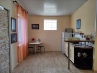 | 1 Этаж. Комнаты раздельные. В номере имеется: двуспальная кровать с ортопедическим матрасом, раскладные диван и два кресла, шкаф и комод для одежды, тумбочки, журнальный столик, утюг. Кухня укомплектована: фильтром для воды, всей необходимой посудой и техникой. Холодная и горячая вода круглосуточно. Выход на открытую террасу. |