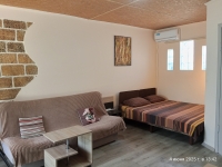 Хорошее место для семейного отдыха. Частное домовладение расположено на берегу моря. До пляжа 20 метров. На территории два дома. Всего четыре номера: три 2-х комнатных и один 1-комнатный. В каждом номере: мебель, техника, удобства, кухня с необходимой посудой и техникой. Также питаться можно в столовой или кафе которые расположены недалеко от дома. На всей территории и в номерах бесплатный Wi-Fi. Есть место для машин. Возле каждого дома есть мангал для приготовления шашлыка. Предоставляется услуга по стирке одежды. Бронирование номеров по указанному телефону.