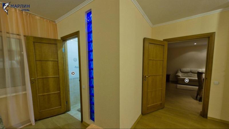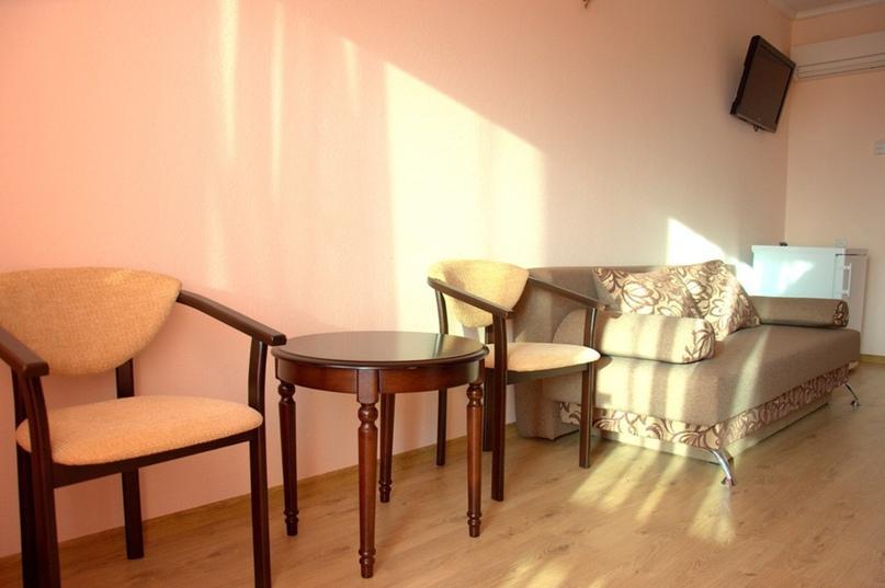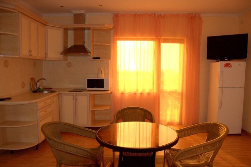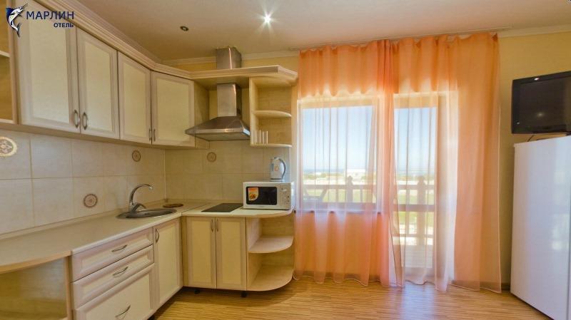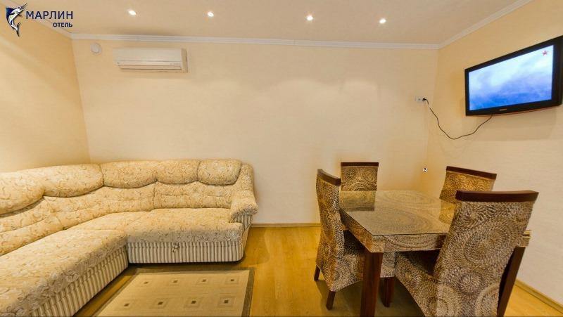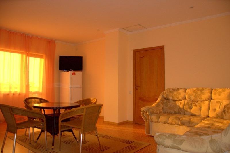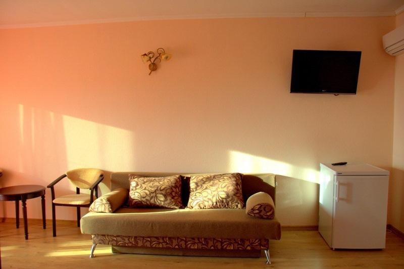 | Двухкомнатный номер с индивидуальной кухней, рассчитан на 4х местное проживание. Площадь номера 60 м2, находится на 2 этаже с балконом и видом на море. В номере есть зеркальный шкаф-купе, большая двуспальная кровать с ортопедическим матрацем (итальянская мебель), раскладывающийся угловой диван, кофейный столик, туалетный стол с большим зеркалом, два больших LCD-телевизора с лучшими каналами кабельного телевидения, бесплатный беспроводной интернет WI-FI, две прикроватные тумбочки, два современных кондиционера с очистителем воздуха, сейф, санузел (душ, туалет, умывальник, фен). Студия-кухня с полным набором посуды и всего необходимого, обеденный стол, стулья, двухкамерный холодильник. |