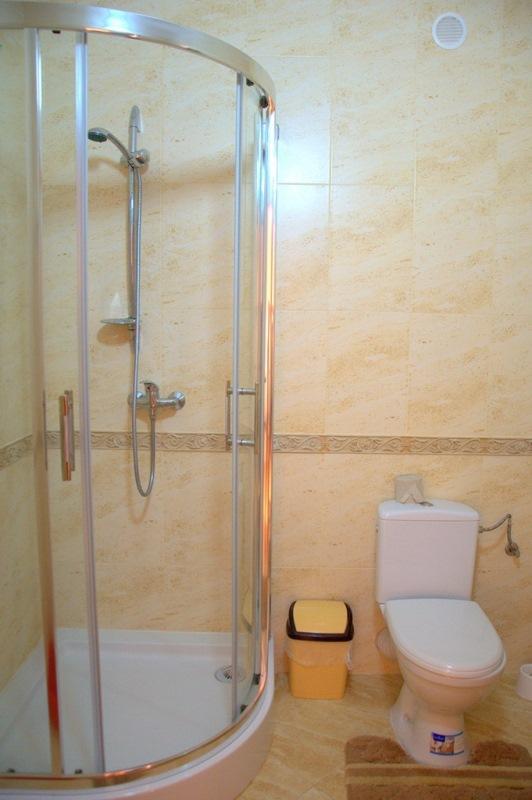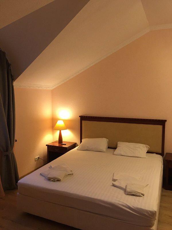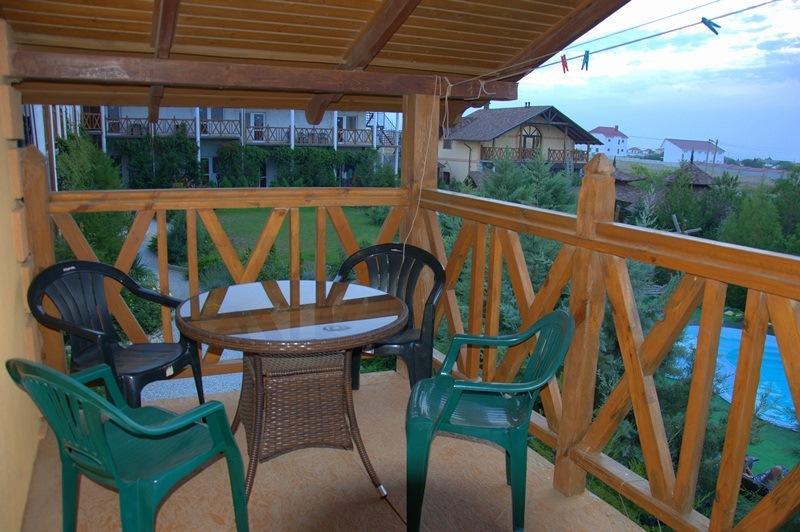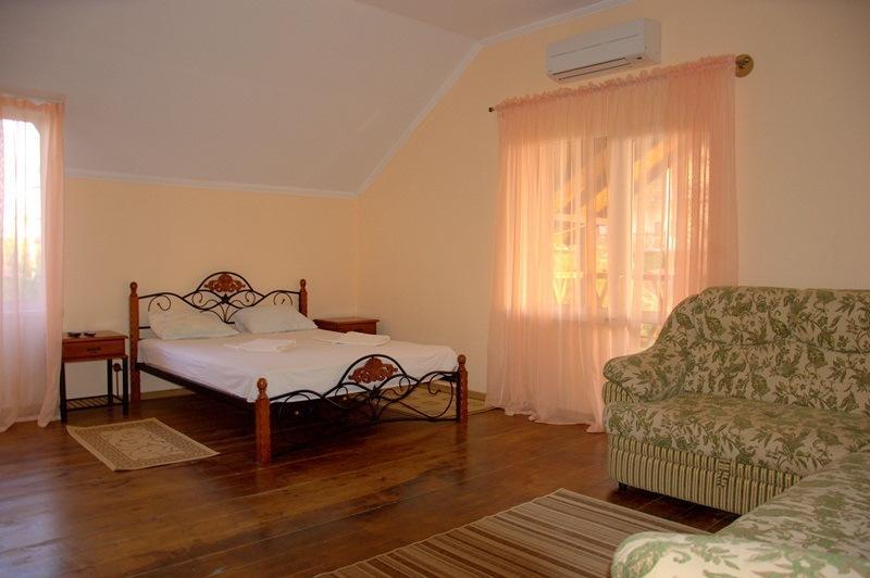 | Находится на 2-м этаже отдельно стоящего здания, с балконом, мебелью. В номерах: двуспальная кровать, две прикроватные тумбочки, туалетный столик с большим зеркалом, раскладывающийся угловой диван, 2 LCD TV спутниковыми каналами, сейф, холодильник, чайник, кондиционер, санузел (душ, туалет, умывальник). На балконе плетеная мебель. |