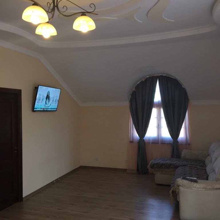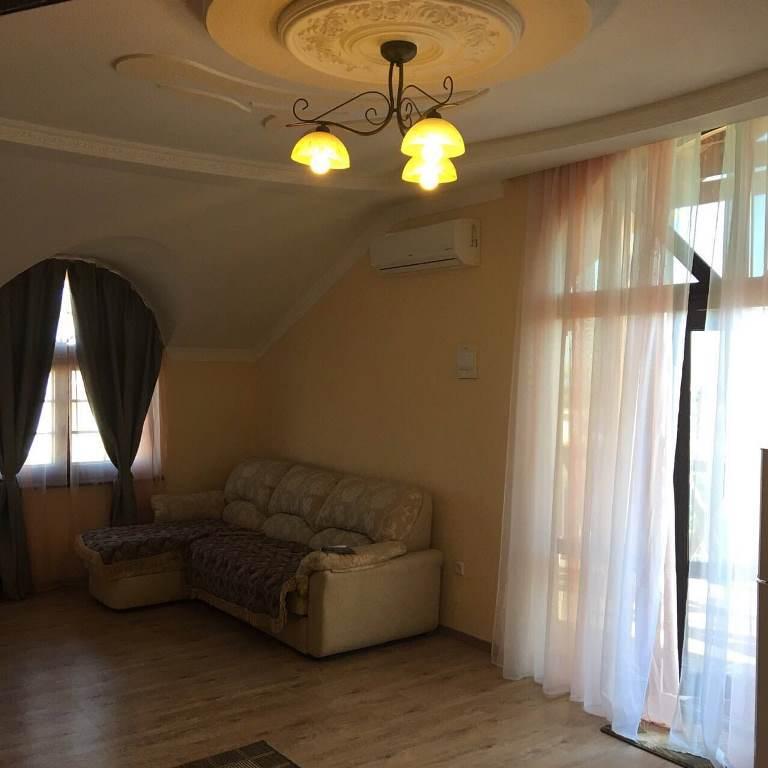 | Отдельно стоящий 2-х этажных дом. Номер на 1м этаже с собственной зоной отдыха: беседка, мангал. Номер на 2м этаже с видом на море, балкон 20м2, мебель, отдельный вход. Номер 80 м2, трёх комнатный: кухня-гостиная с полным набором посуды, свч, электроплита, чайник, 2х камерный холодильник, обеденный стол, кондиционер, smart TV, угловой раскладывающихся диван, шкаф-купе. Две спальни: в одной 2х спальная кровать, в другой две односпальные. Санузел: унитаз, биде, умывальник, душ, шкаф, фен, гигиенические принадлежности, полотенца, халаты. |