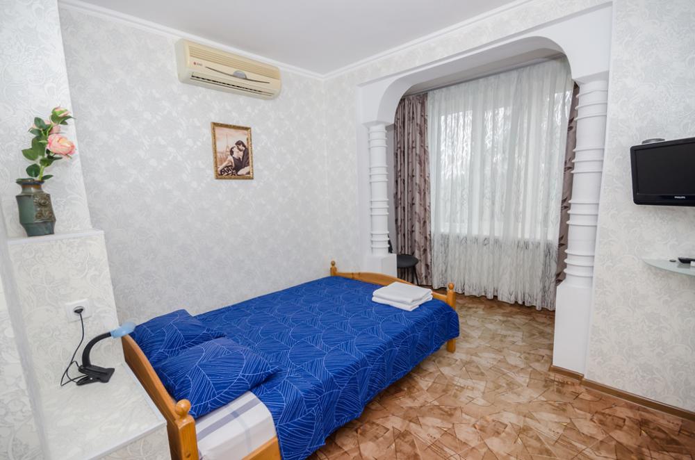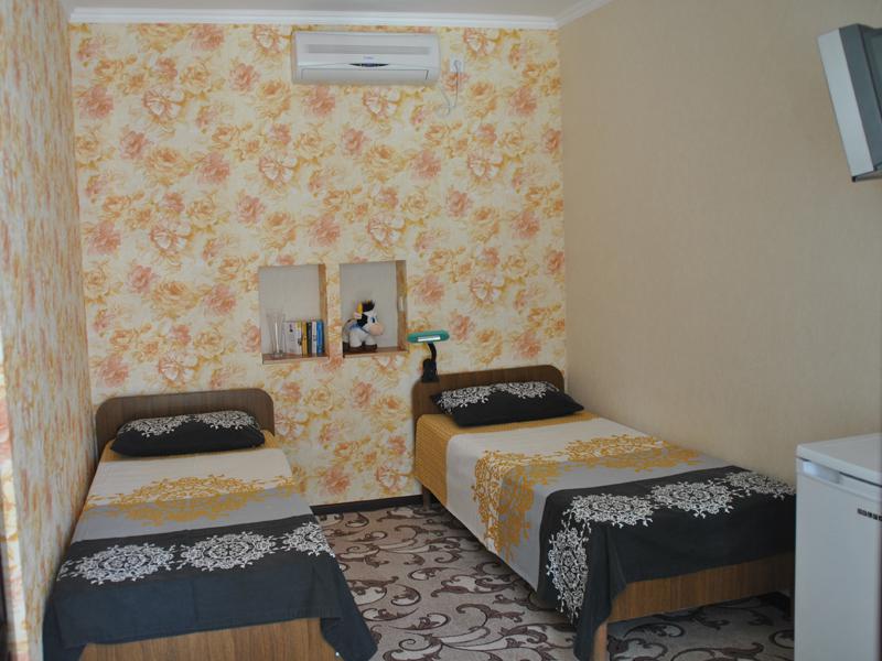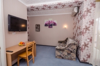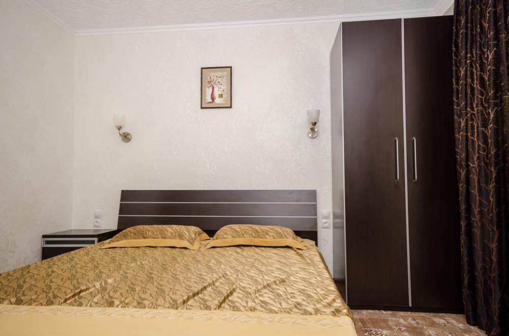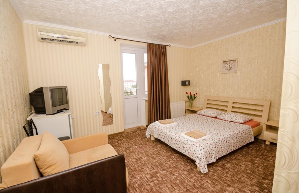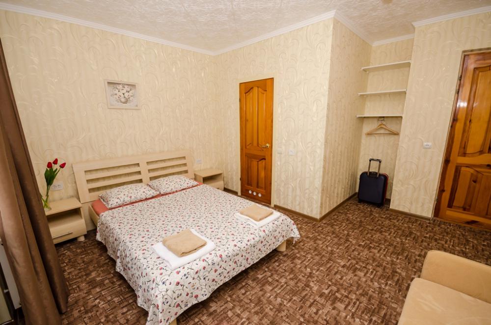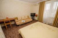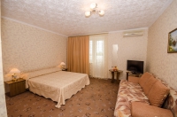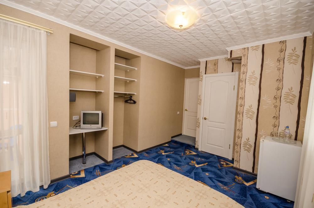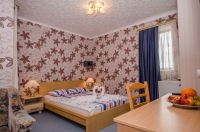 | Двуспальная кровать шириной 180 см или 140 см, прикроватные тумбочки (импортное производство), встроенный шкаф или отдельно стоящий, стол, стулья, в некоторых номерах есть балкон, раскладной диван |