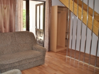 | 1 Этаж: гостинная-студио (кухня, мягкая мебель), деревянная удобная лестница (с ограждением), душевая комната, веранда. Меблировка: кухонная мебель, раскладной диван. На веранде пластиковая мебель. 2 Этаж: спальня, санузел. Меблировка: четыре односпальные кровати, прикроватные тумбочки, шкаф, стол, стулья, кресло. |
