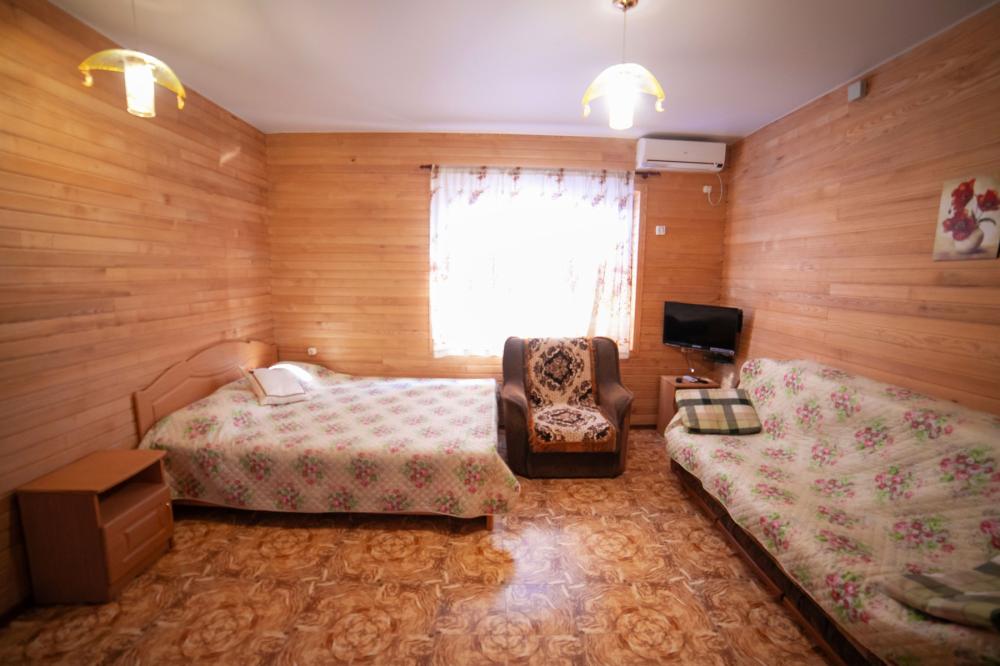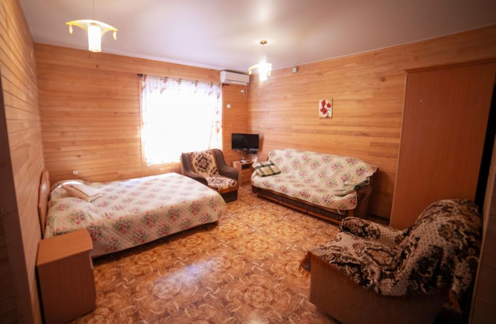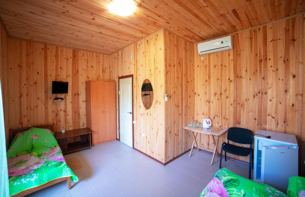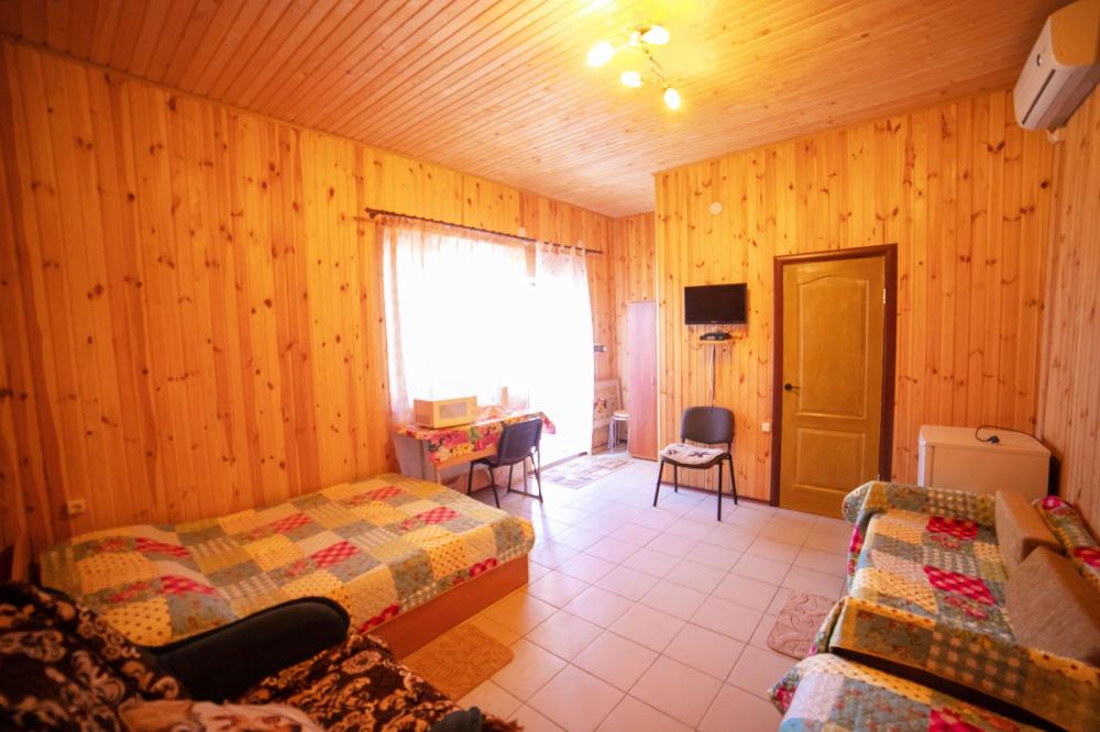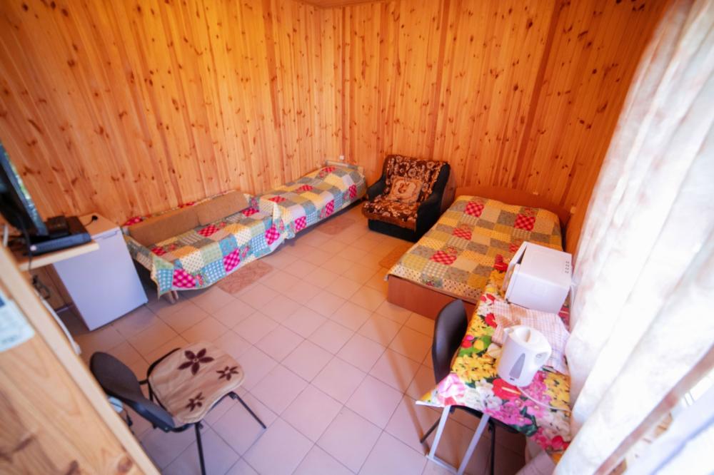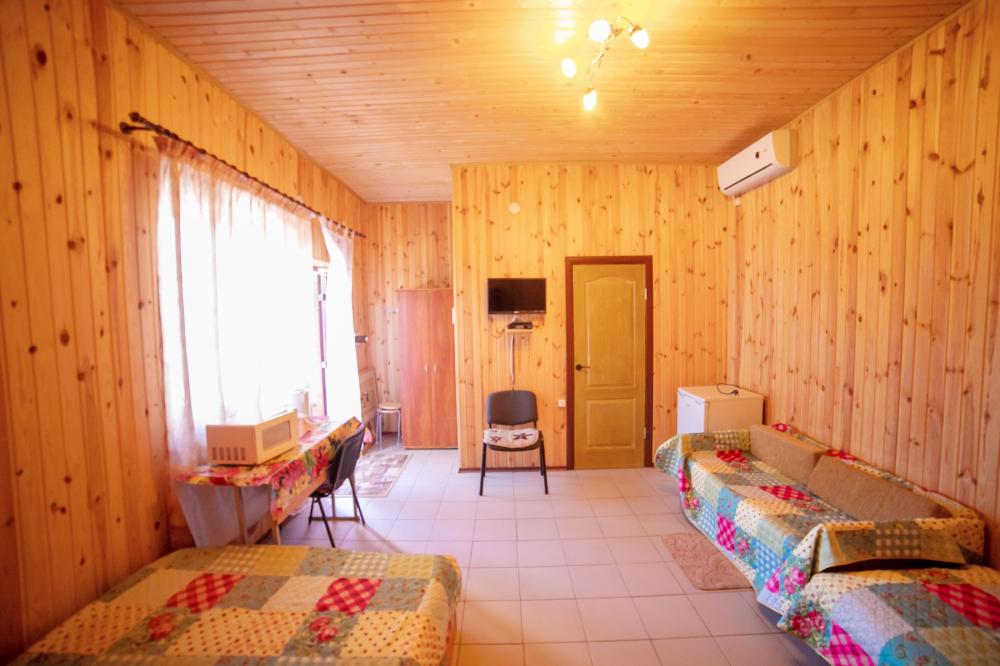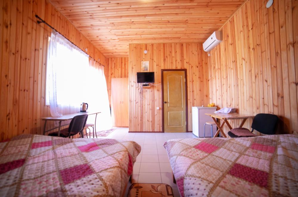 | Четырехместный номер находится на первом этаже, со всеми удобствами, с видом на виноградник. Возле номера терраса со столиком и стульями для отдыха. Номер отделан деревом. В номере круглосуточно холодная и горячая вода, кондиционер, холодильник, микроволновая печь, телевизор, эл чайник, посуда. Таких номеров два и отличаются они конфигурацией спальных мест. Стоимость доп места 700 рублей в сутки. |