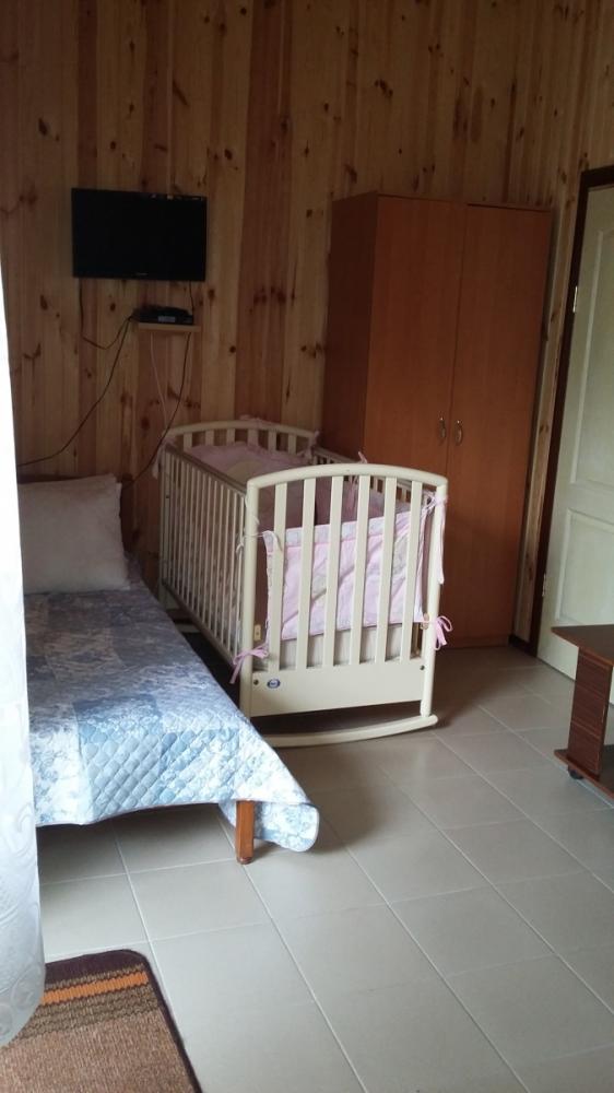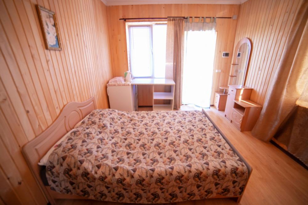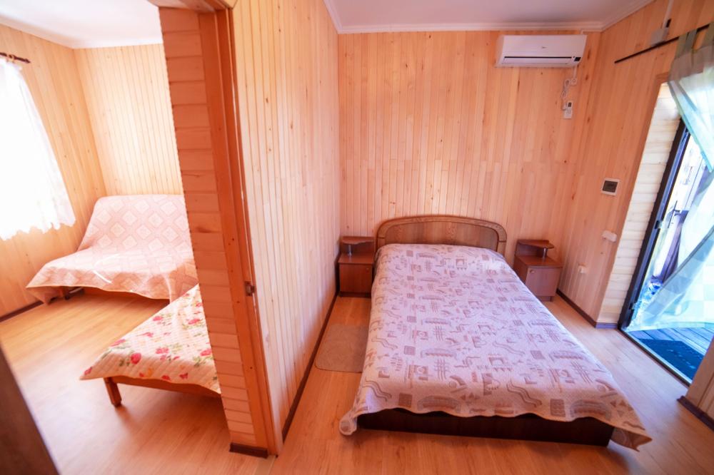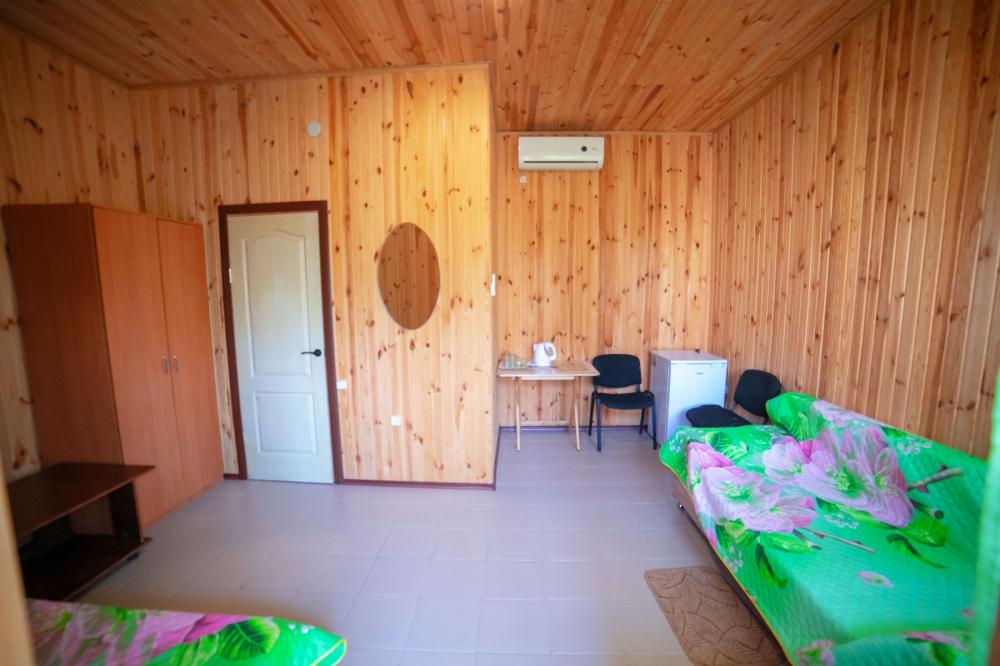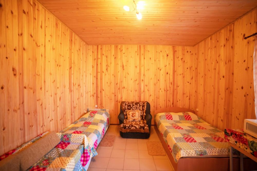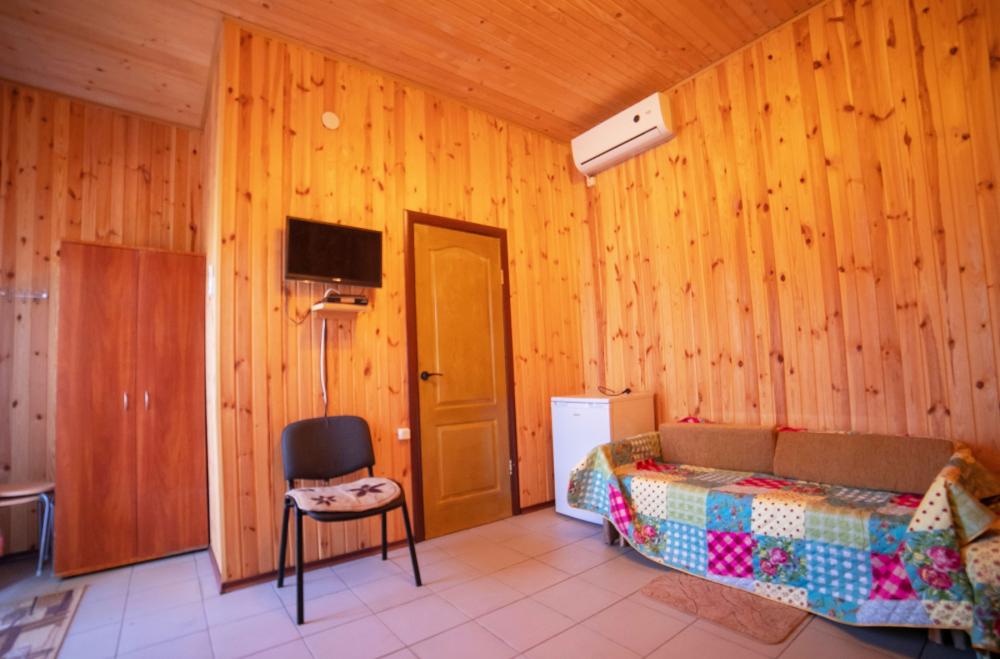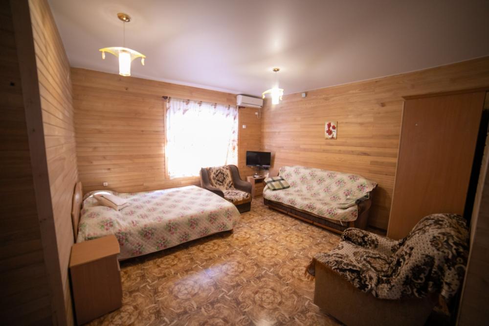 | Четырехместный номер находится на первом этаже, со всеми удобствами, с видом на виноградник. Возле номера терраса со столиком и стульями для отдыха. Номер отделан деревом. В номере круглосуточно холодная и горячая вода, кондиционер, холодильник, микроволновая печь, телевизор, эл чайник, посуда. Таких номеров два и отличаются они конфигурацией спальных мест. Стоимость доп места 700 рублей в сутки. |