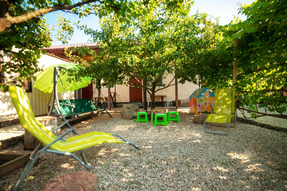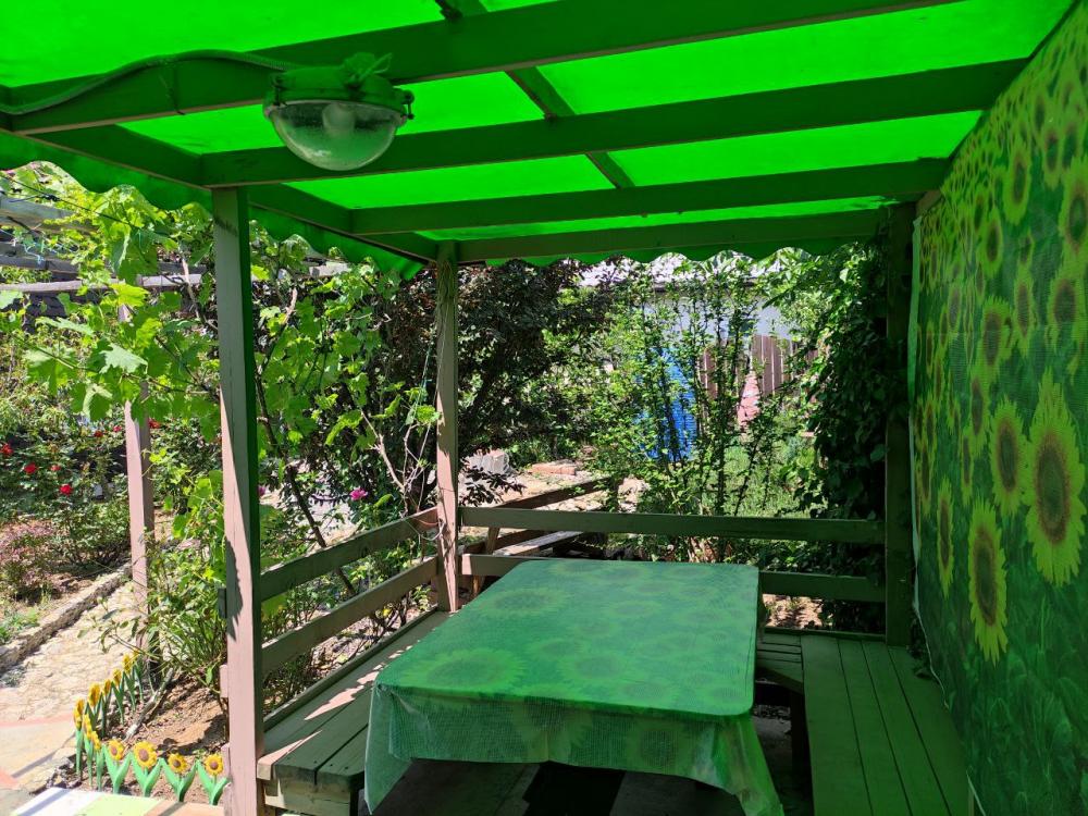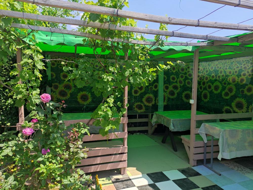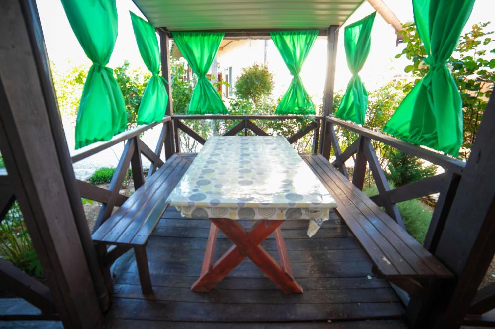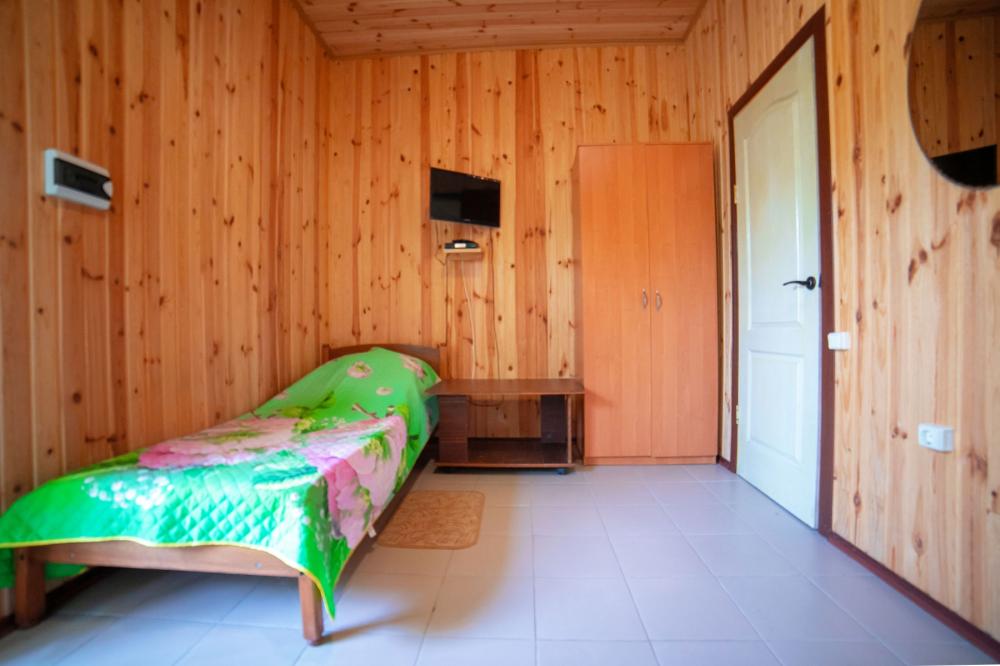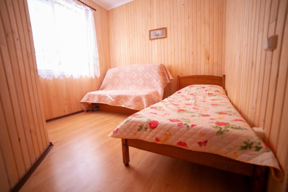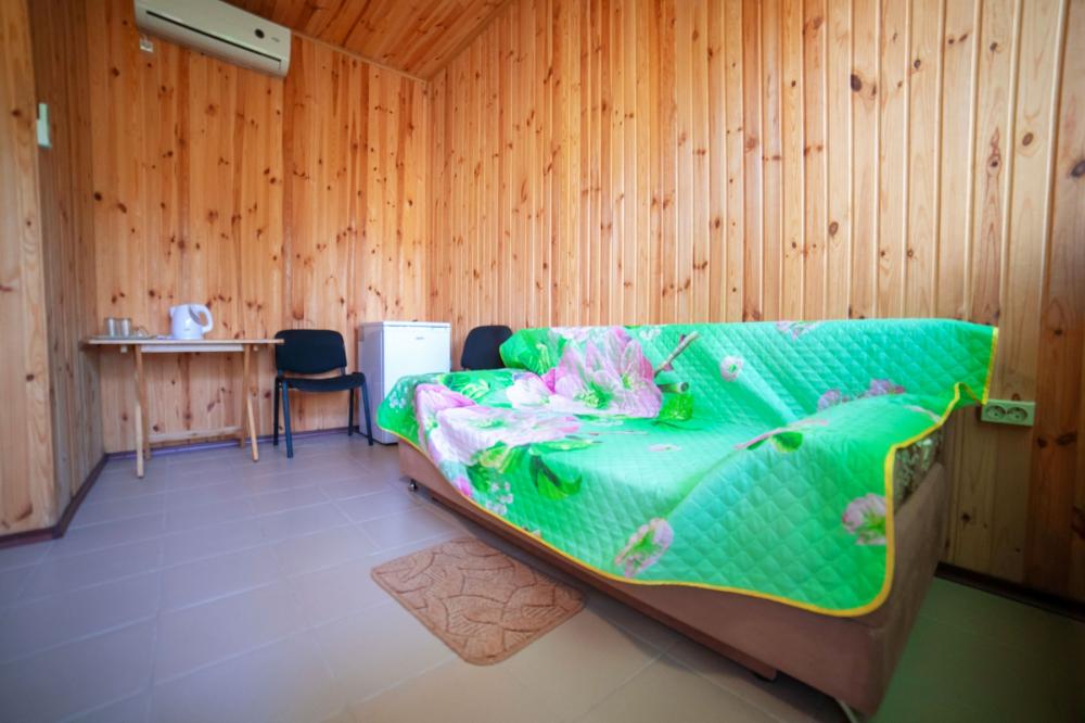 | Четырехместный номер находится на первом этаже, со всеми удобствами, с видом на виноградник. Возле номера терраса со столиком и стульями для отдыха. Номер отделан деревом. В номере круглосуточно холодная и горячая вода, кондиционер, холодильник, микроволновая печь, телевизор, эл чайник, посуда. Таких номеров два и отличаются они конфигурацией спальных мест. Стоимость доп места 700 рублей в сутки. |